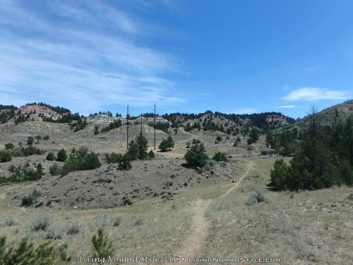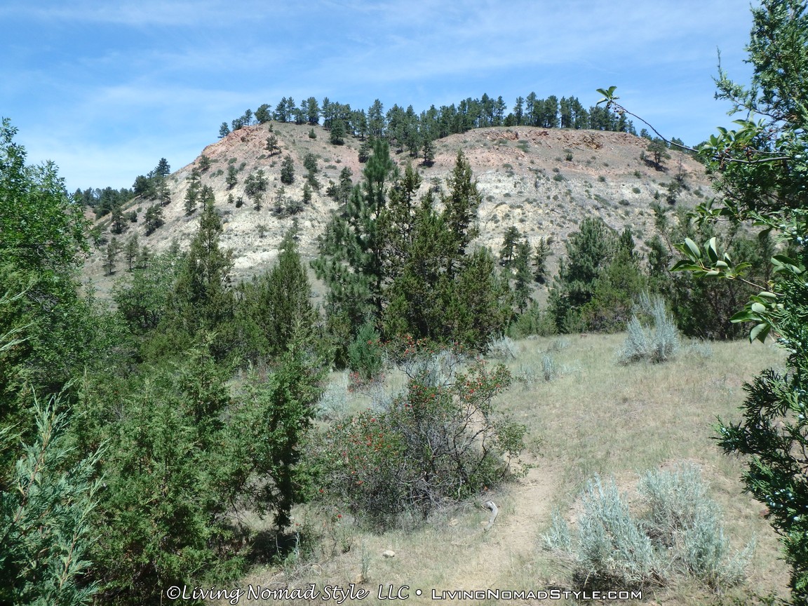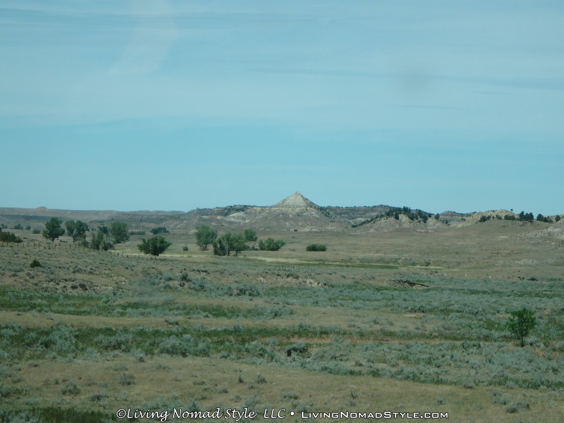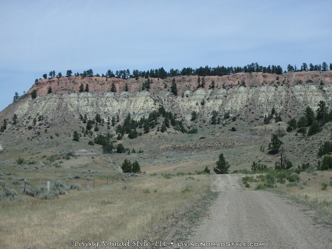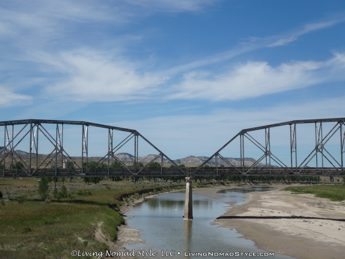 We left, decided to road trip it a little bit in the opposite direction and do some sight-seeing. Along the way we came up to a Historic Marker sign. We pulled over and saw nothing. Commonly there are plaques that say why it is historic. Nope. Nada. Nothing. So, back in Ebony we jumped and away we went. We came across an interesting, old metal bridge that was not in use any longer. It spanned the Powder River. The river had almost no water in it. We guessed it was named for the powdery dirt that made up the riverbed. We turned around and headed back. On the way back I saw a rock formation off in the distance. It looked like a pyramid! No joke! I joked and told Mama Nomad that they didn’t just build pyramids in Mexico and South America, they also did so in Montana.