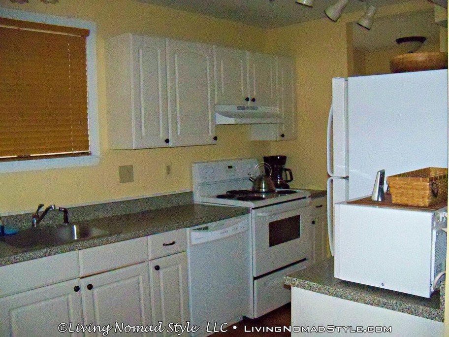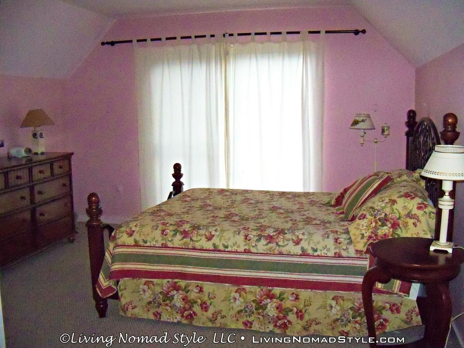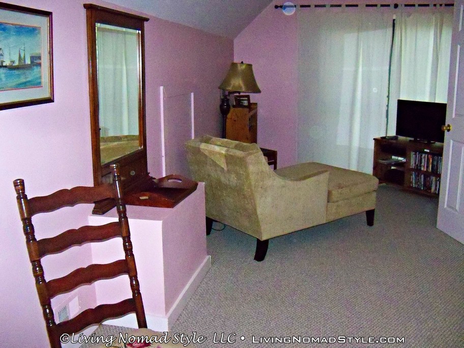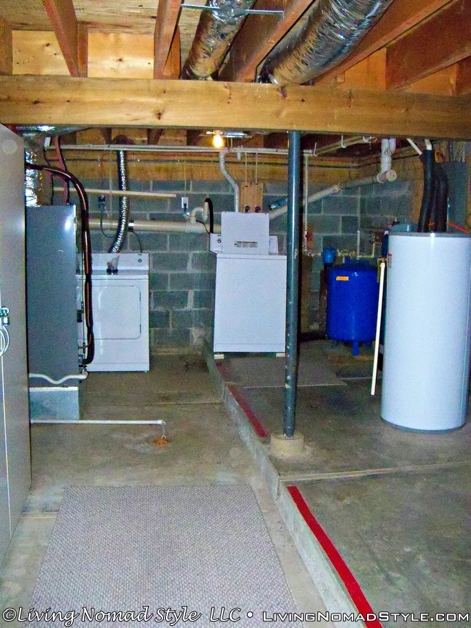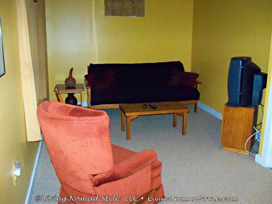There’s a basement with a door that leads outside with a concrete patio area. Also, in the basement, is a huge storage area that also houses the washer, and dryer. This storage area was great for us to store our bins in after we unpacked. We used the basement for two things; a game room for board, and card games because there’s a table down there, and also as one of the bedrooms by folding out the futon to use as a bed.