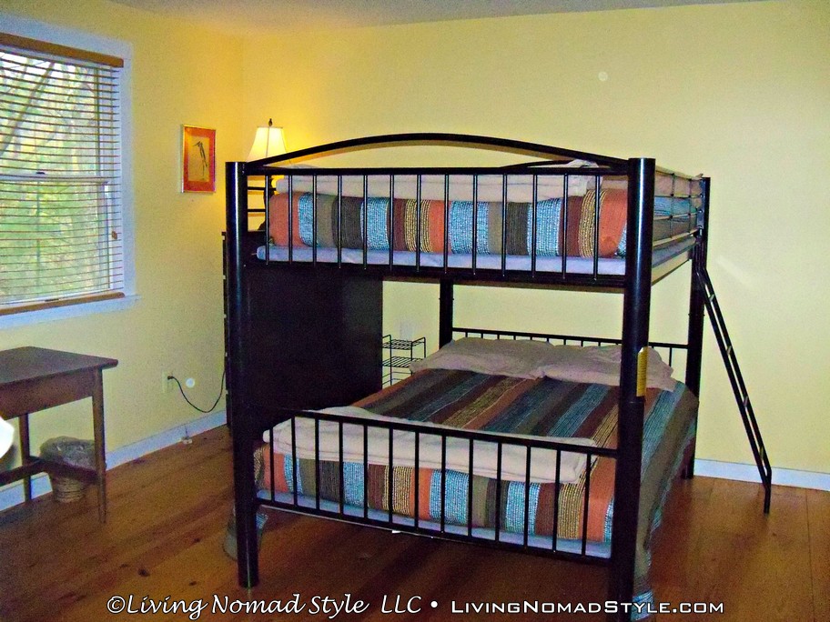 The main level of the house is almost all surrounded by deck, and has patio furniture to be able to enjoy the view. It was utilized a lot during our stay. This level also has one of the bathrooms, a bedroom, the living room, dining room, and kitchen area. This bedroom has full size bunks that were perfect for a couple of the nomad boys. The older two boys enjoy their own space, so they alternated who would get the basement room, and who would share. Our littlest nomad loves to share space, and be with someone all the time.