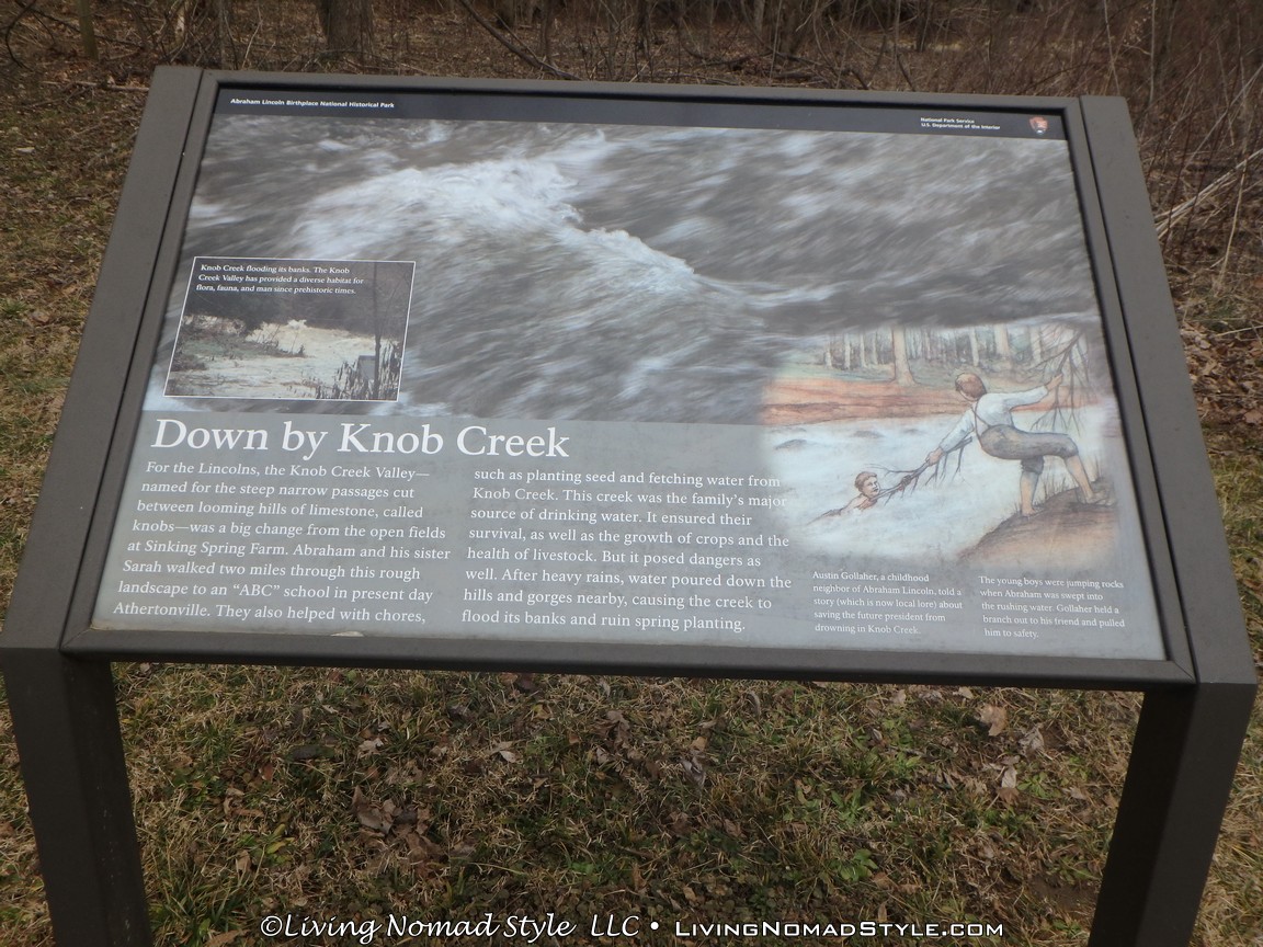 After we left the birthplace, we headed to Knob Creek to see Lincoln’s boyhood home. He often wrote about memories he had during his time at Knob Creek; one of them being how he almost drowned, and was saved by a friend. Crazy enough, on our way trying to find Knob Creek, I took a wrong turn, and ended up at the cemetery where Lincoln’s friend, who saved him from drowning, is buried, Austin Gollaher. Anyway, the Lincoln family lived at Knob Creek for only 7 years before moving on to Indiana. This park was a little disappointing only because there really wasn’t anything there. There are no park rangers, no visitor center; just a couple of signs, and cabins. We did venture down to the creek that Lincoln was said to have almost drowned in.