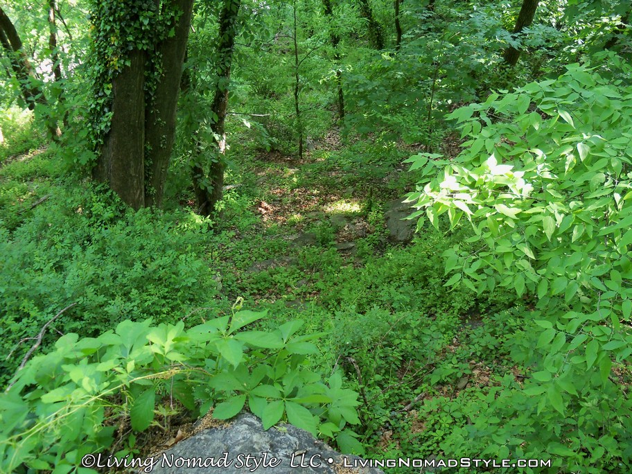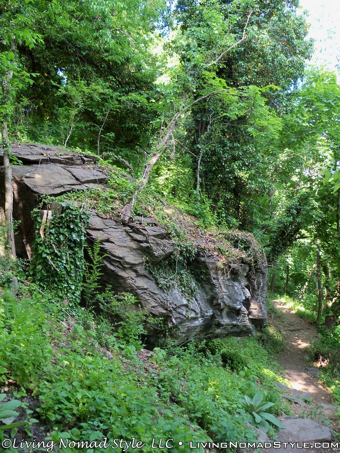 We headed out and on our way following the trail markers through town, down a set of twisty stone steps and onto the actual Appalachian Trail; at which point you could head north or south. We wanted to go towards Jefferson Rock and Harpers Ferry Historic Town, so we went North. The path twisted and curved along the mountainside. You could see glimpses of the river through the foliage. And we saw deer on the hillside.