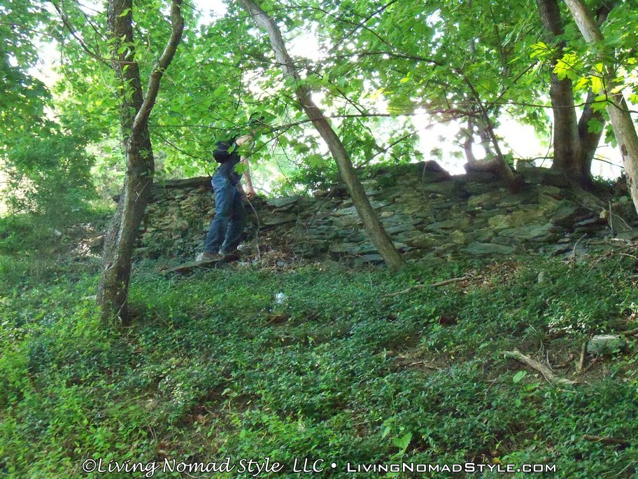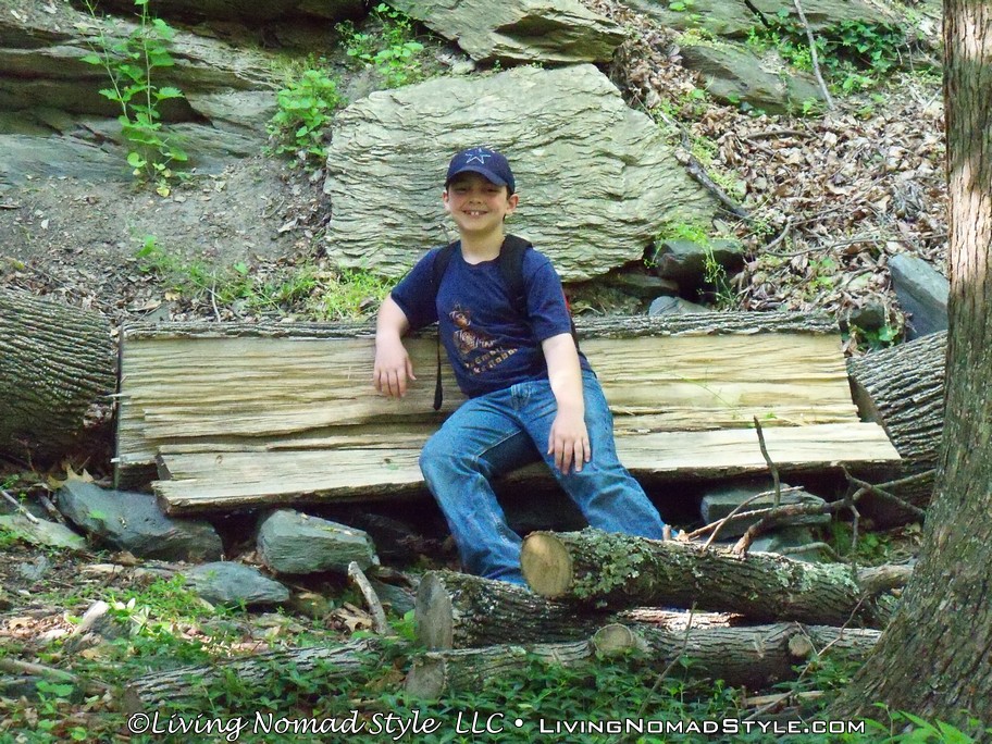 We saw a few interesting things along the way. At one point, there was a tree that fell over and it looked like someone cut a section of that tree and turned it into a bench. Which, of course, Trevor had to try out. Venturing a little bit further we came upon another set of stone steps. Ethan was up to bat and wanted to check it out. It so happens that at the top of those steps was Harper Cemetery.