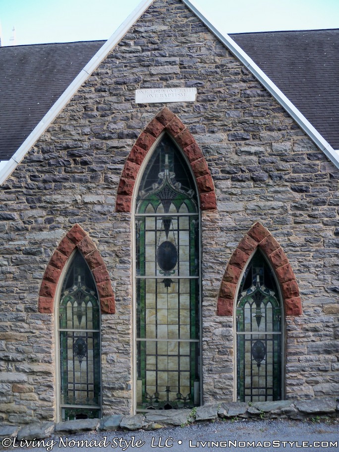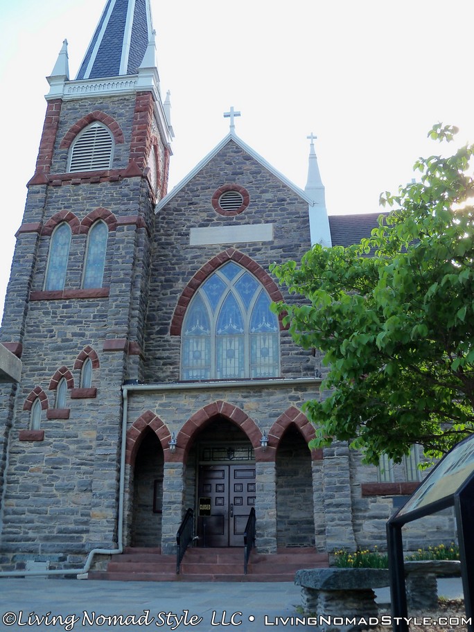 Within eye shot on the right you can see St. Peter’s Roman Catholic Church. It had beautiful architectural features along with ornate stained glass. There was also a sign outside of it that advertised ghost tours of the area. This intrigued me so I went exploring around. In front of the church, on the hillside, was a door that went into the hillside. Because I am curious, I checked if it opened or not. Bingo! It did. The boys and I went exploring inside. It seemed to go under the church. We didn’t go to far because I was not sure of structural integrity. But it was neat and spooky at the same time.