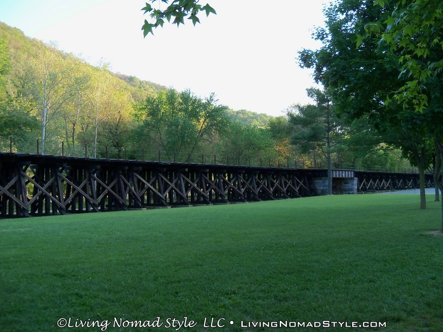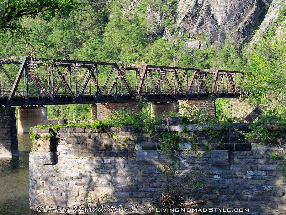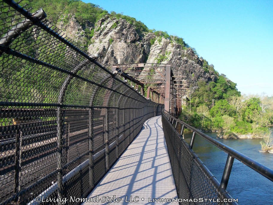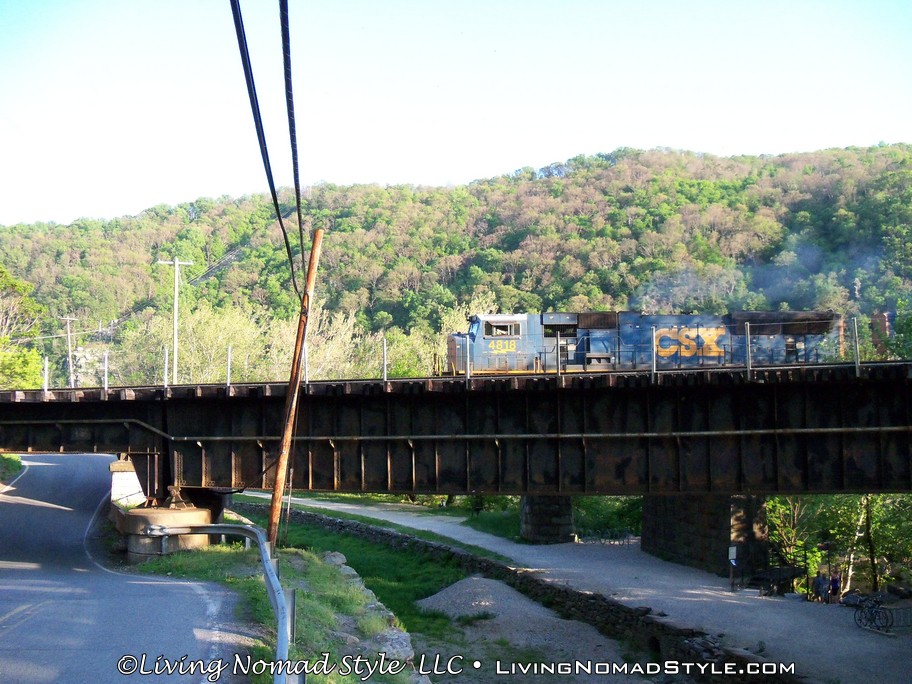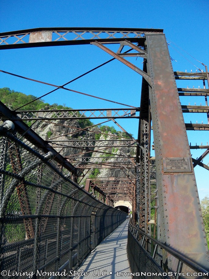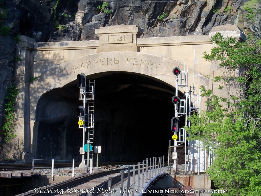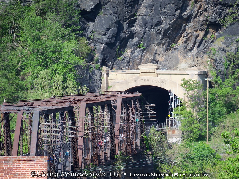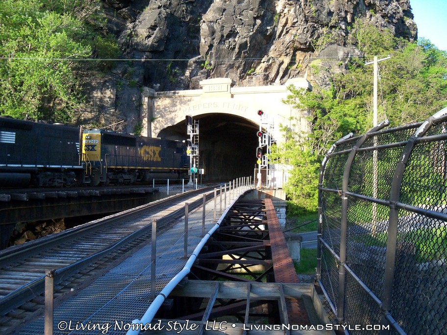 From Harpers Ferry Historic Town you can continue onto a foot bridge that is located on the side of a railroad bridge that crosses the Potomac River. This bridge is still used by trains and if you stand on it long enough, you will see one pass. We saw two of them while we were hiking. The bridge leads into a tunnel on the other side of the river. Spoiler alert, you cannot go into the tunnel on foot. We were a little bummed by that. But, the bridge crossing was still enjoyable. And, when you hit the other side, you are in Maryland where you can continue onward with the Appalachian Trail towards Maine.
