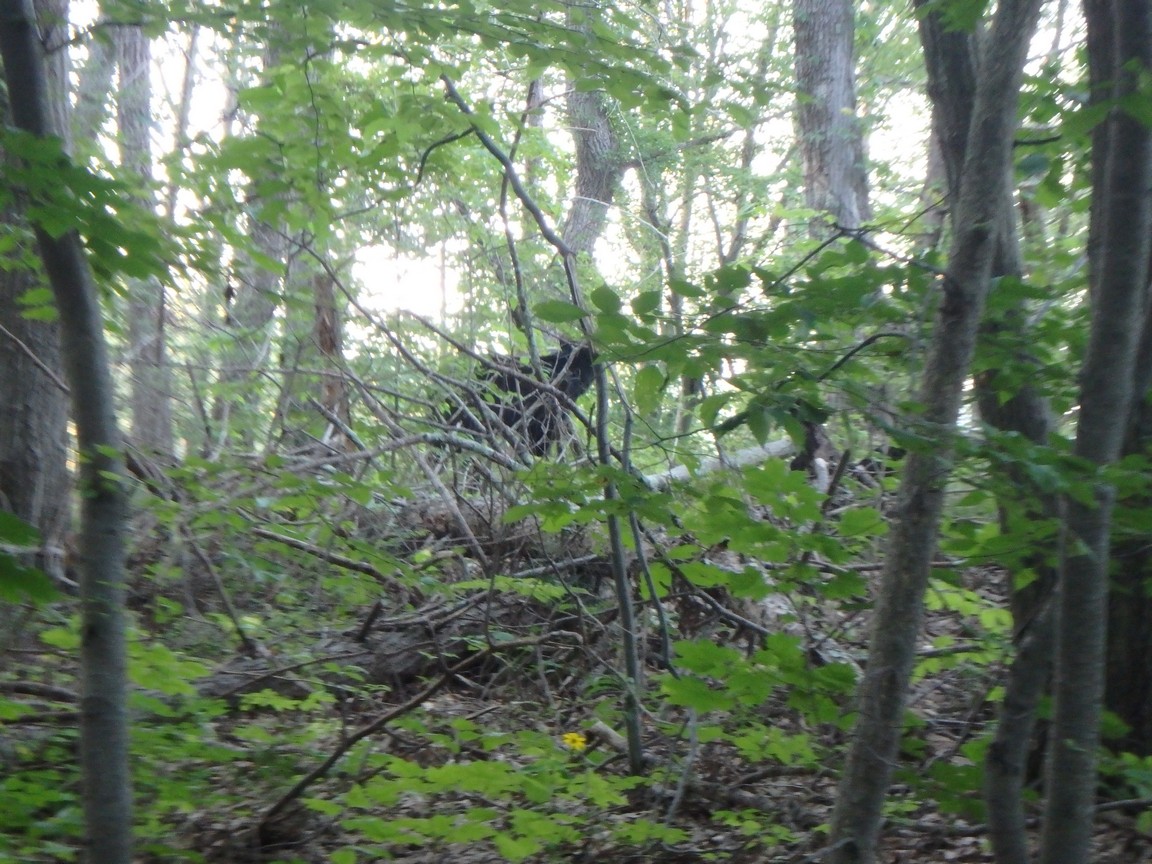 When we got to his spot, we looked in the direction he was pointing and what did we see? Why a big black bear looking back at me! The ridge was at a higher elevation than the trail, by about 10 feet. And the American Black Bear was about 20 feet away. It was looking over the edge of the ridge and eating on the vegetation. It looked over at us, but really did not pay us any attention. We admired it for a bit, snapped a few images and we were on our way.