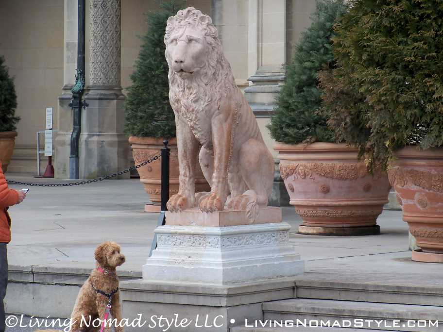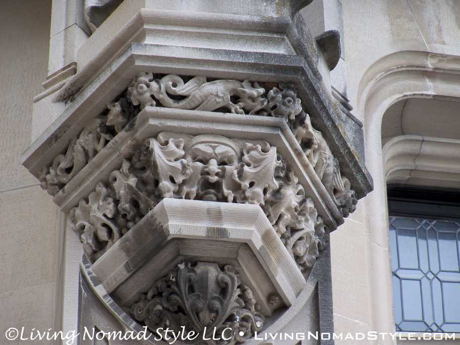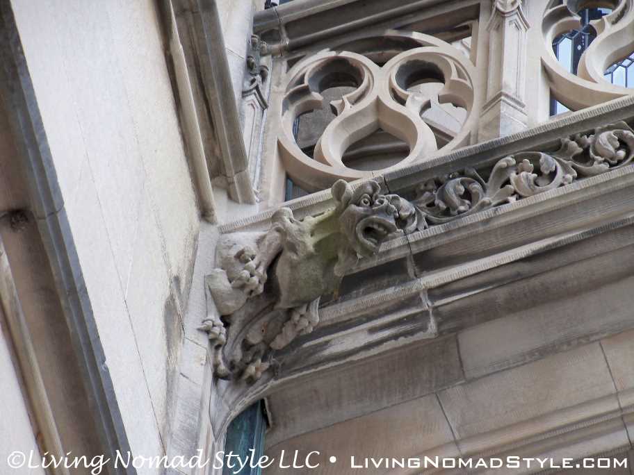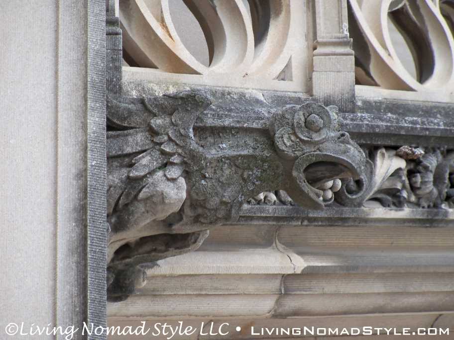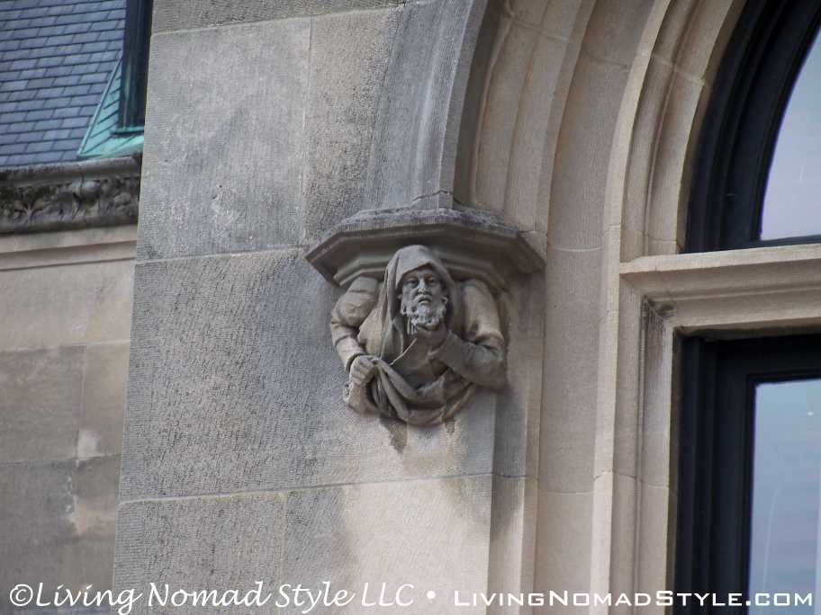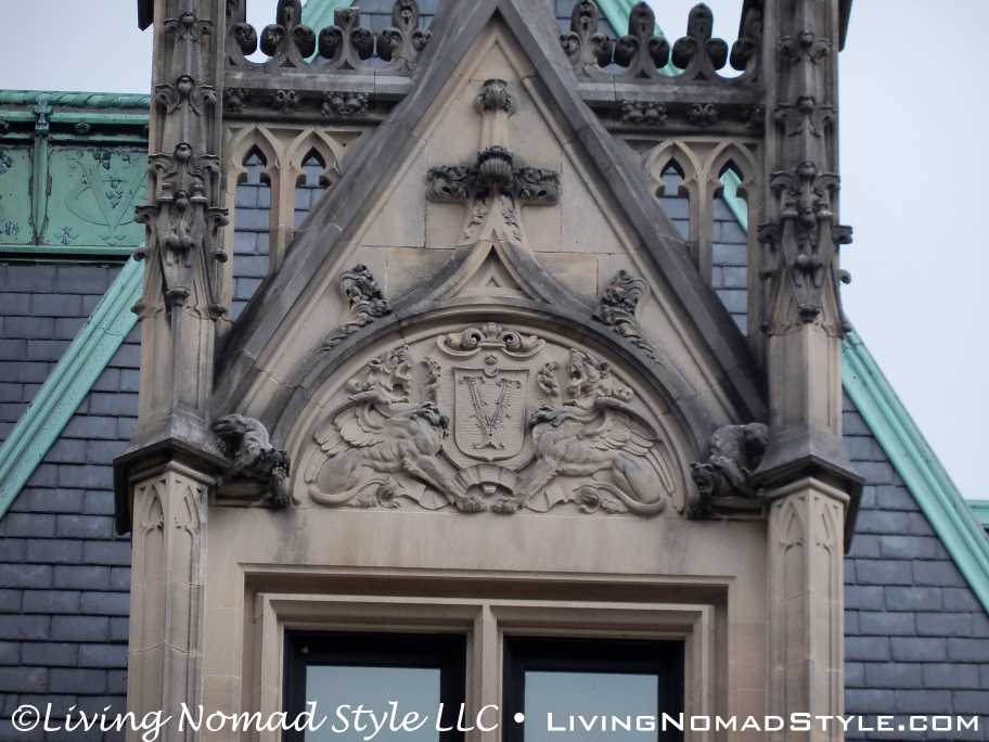 We began our exploration of the estate with the main house. We have many pictures of the outside. The exterior of the house has so many intricate details chiseled into it. It seems with every turn there is a V for Vanderbilt, some sort of face or creature and an abundance of acorns that adorn the outside.
