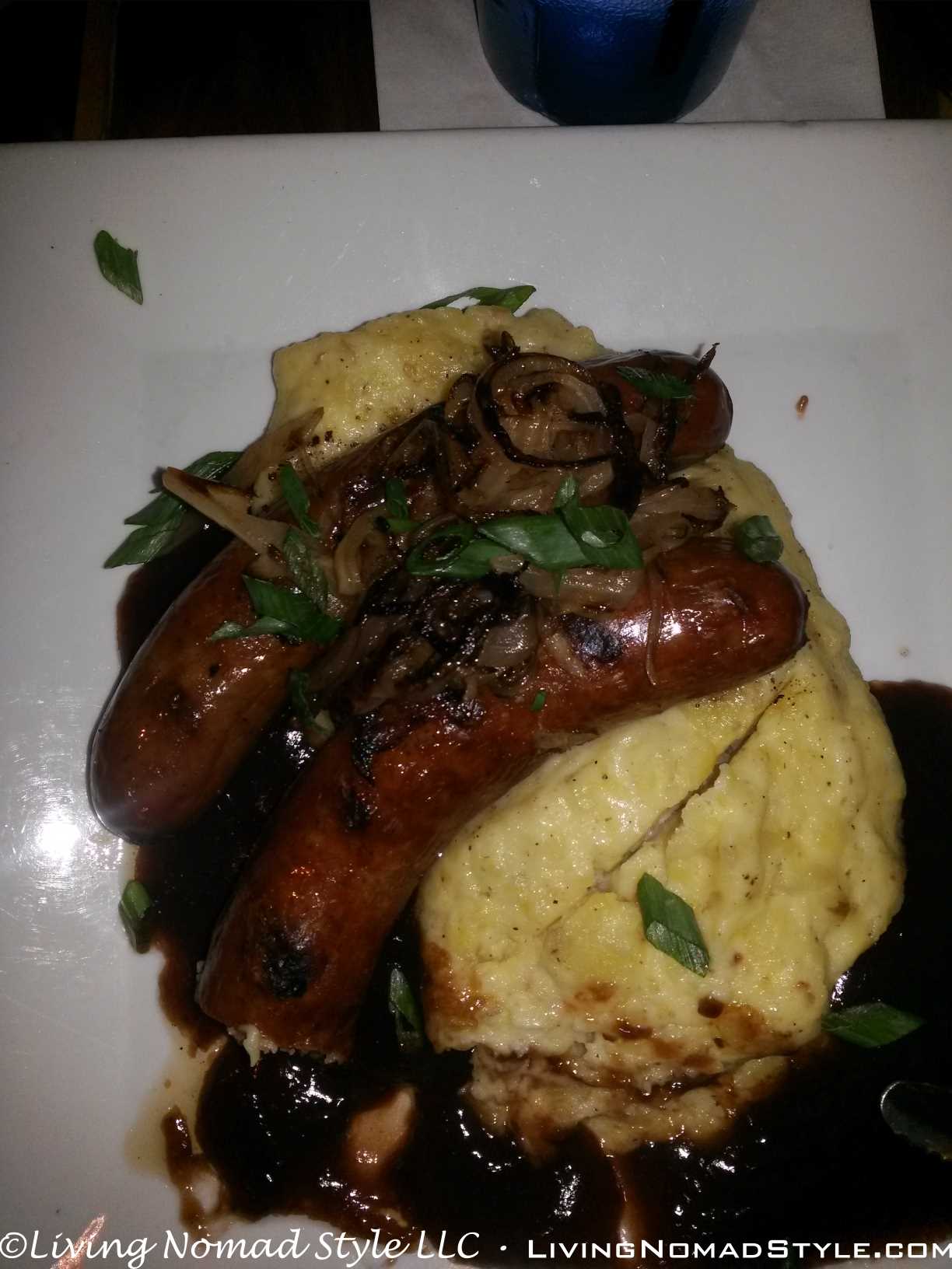 We both enjoyed the entrée I ordered when we ate at Hannah Flanagan’s that we decided to both order the same thing at Black Rose Public House and see how they compared. That entrée was Bangers and Mash. For the uninitiated, Bangers and Mash comes with sausage (bangers) with mashed potatoes (mash) and gravy. It was served with caramelized onions at Black Rose. We both really enjoyed it. The bangers were made specially for Black Rose. The gravy is sweeter at Black Rose than Hannah Flanagan’s. It tasted good to us both. Those who like sweet will enjoy it more than those who don’t.