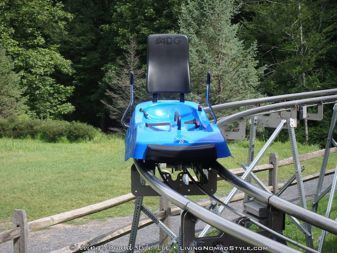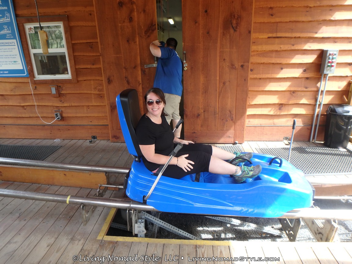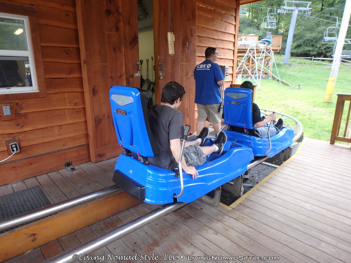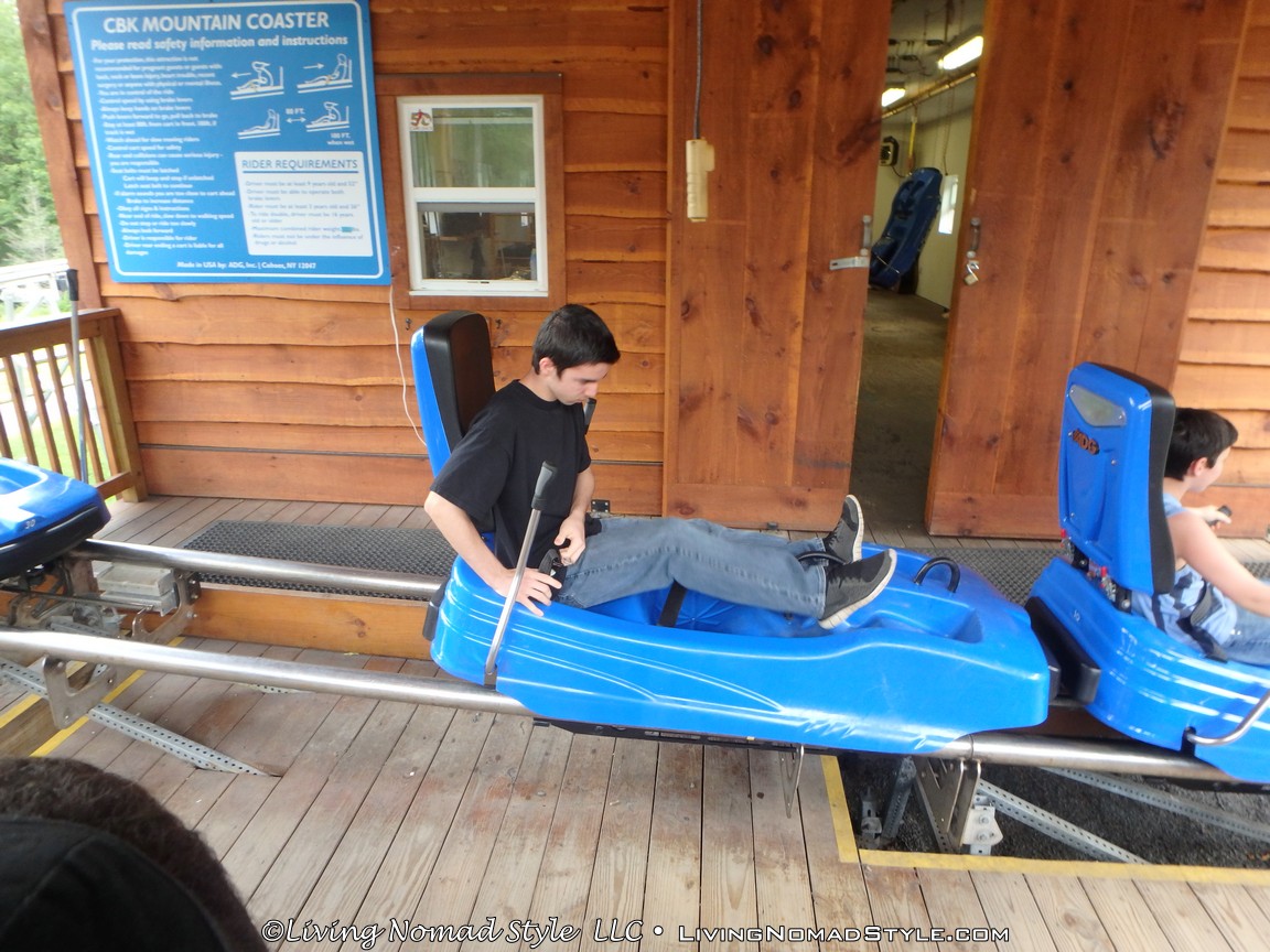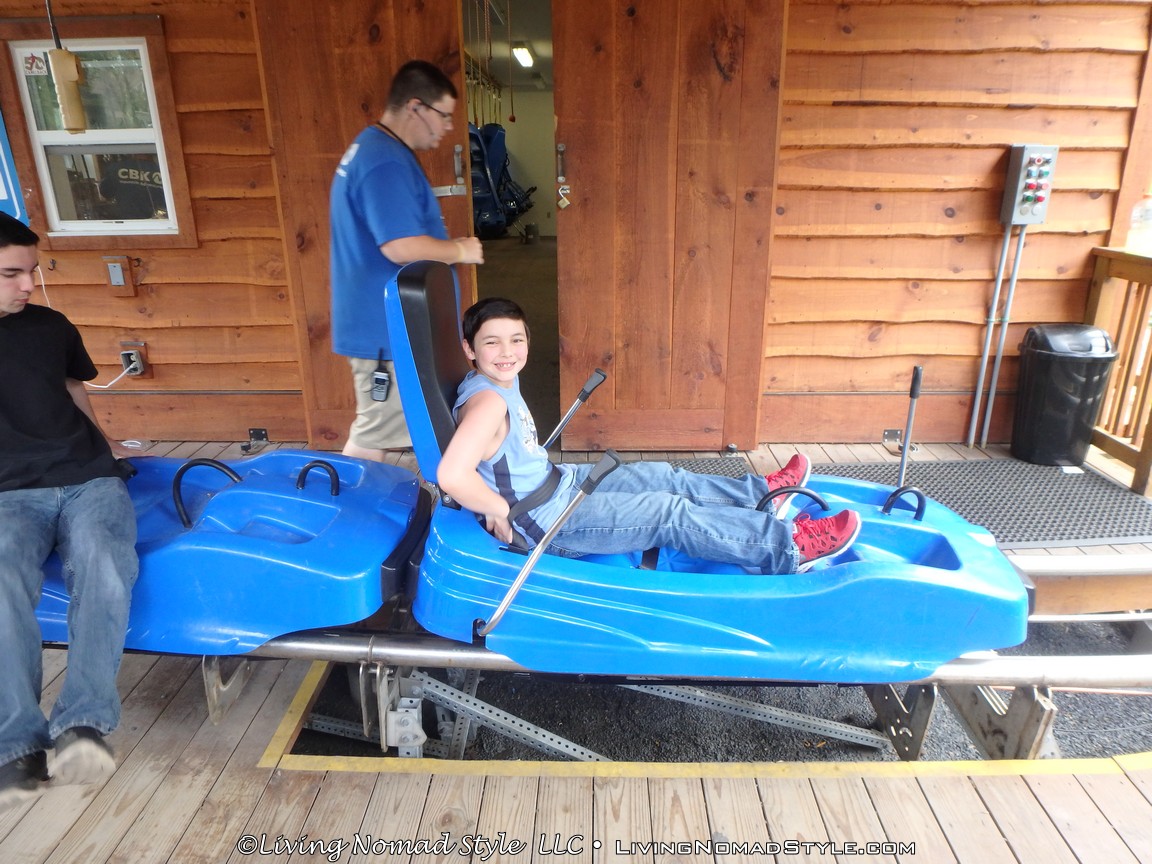 Once we waited in line for a while, it was our turn to go on the mountain coaster. Mama Nomad went first, then I went, followed by Ethan, Noah, and lastly Daddy Nomad. When Mama Nomad sat in the blue cart, she looked pretty scared; but she said “I am going to act like the brakes aren’t even there.”
