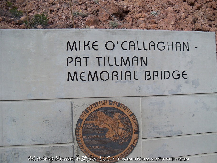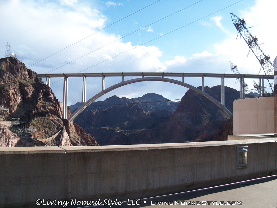 From here we headed out of town towards Lake Mead. That is where the Hoover Dam is located. We drove until we reached the parking of the Mike O’Callaghan–Pat Tillman Memorial Bridge. This is a bridge that stretches across the Black Canyon Area of the Colorado River and connects Nevada to Arizona. It is also the best place to get a birdseye view of The Hoover Dam. It is about a 1/4 mile or so up the steps and ramps from the parking lot to the center of the bridge, where the seal is that says it is the border where Nevada and Arizona join.