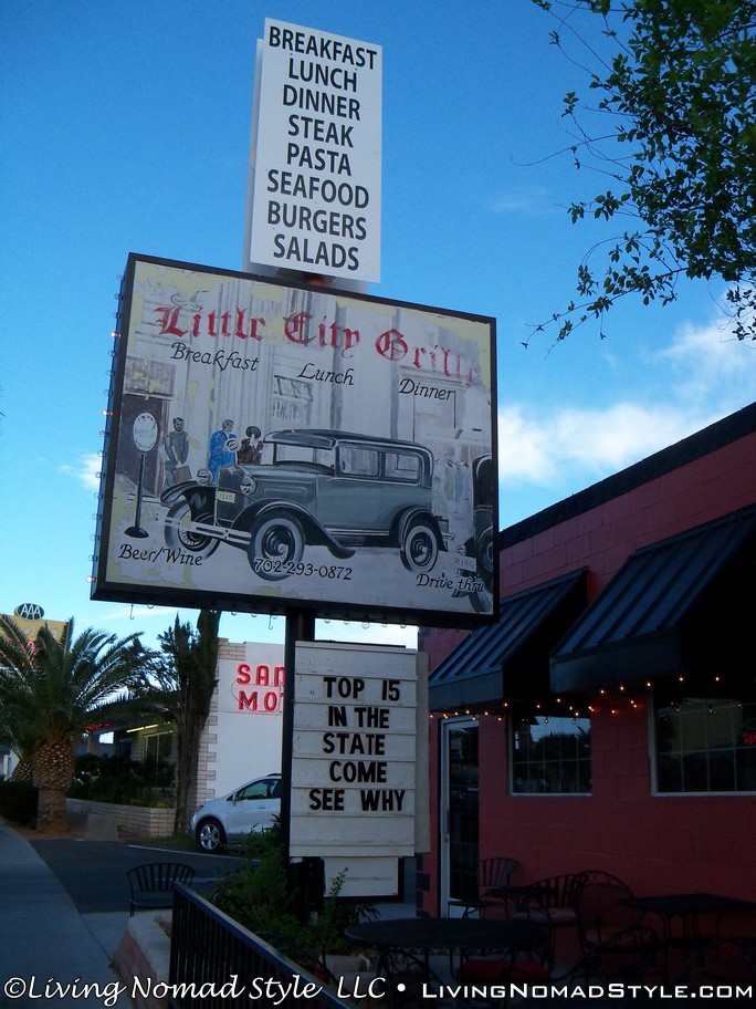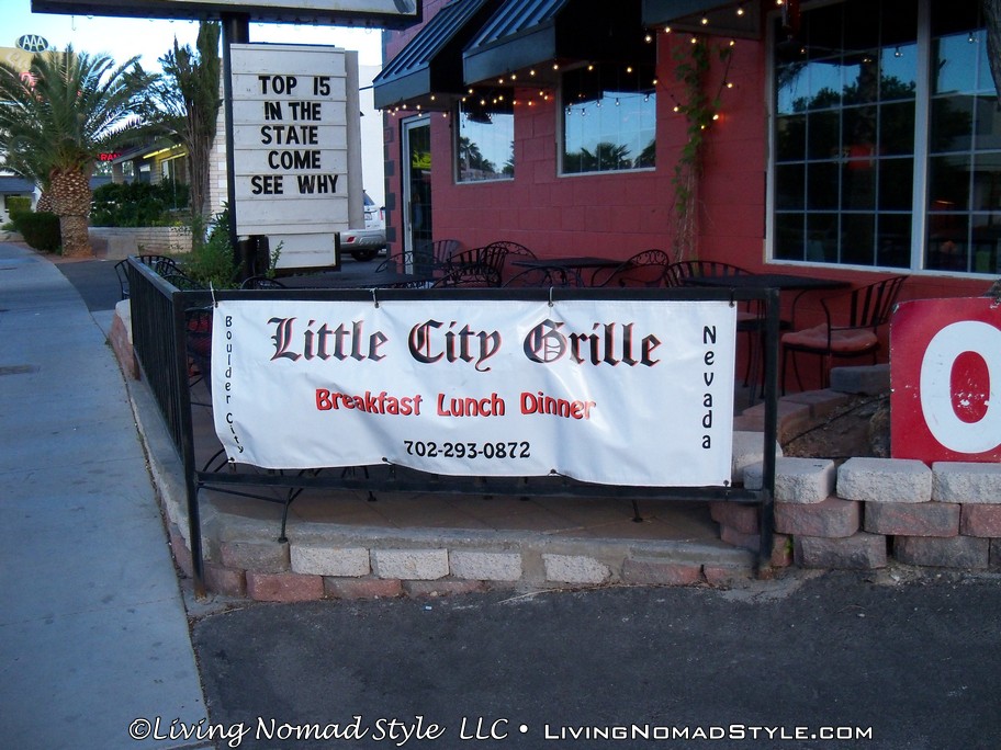 After driving across the dam one way, making a u-turn and coming back across, we decided to grab a bite to eat. I was craving a steak so Mama Nomad found a neat little place called the Little City Grill. So we headed there and Mama Nomad’s parents treated us to dinner. Happy Birthday to me! Had a great steak dinner, free cake for my birthday from them and very cordial service. The atmosphere was pretty cool too.