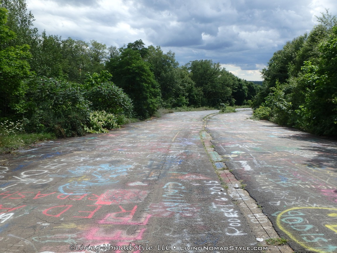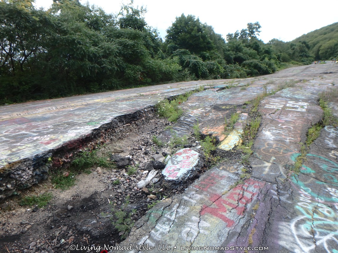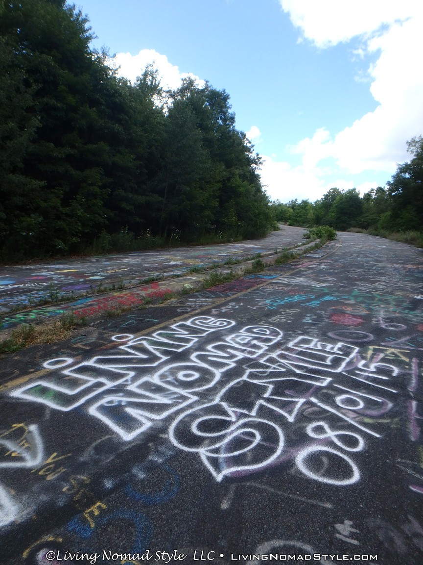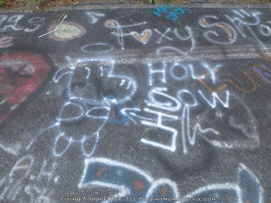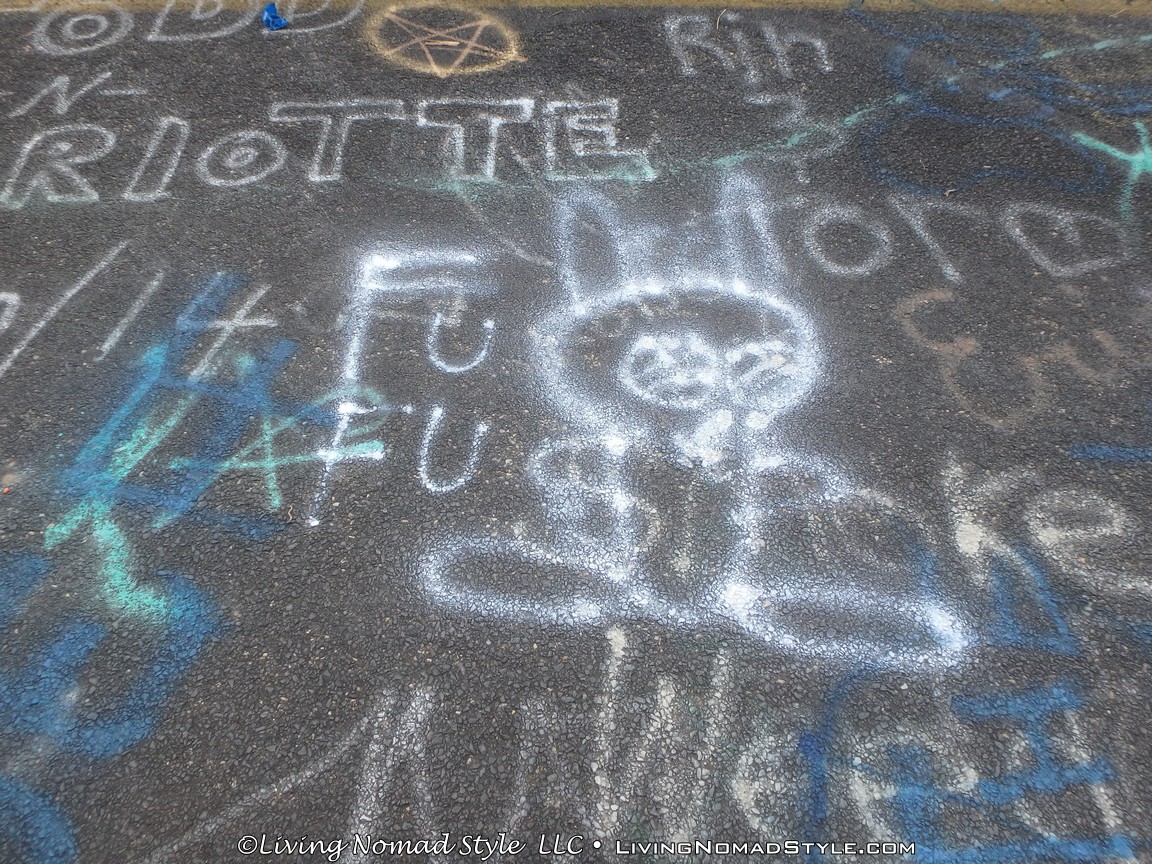 One section of the highway was closed off and traffic rerouted because the fires came up through the road and destroyed parts of it. Now, this stretch is known as Graffiti Highway. Why? Because, sometime after it was closed off, graffiti began to appear on it. Now, people come from far and wide to see it and others to participate in decorating it. It is on the south side of the town as you are heading to Ashland. You can pull over and park right by the north end of it. It has a graffitied yellow directional sign with a black arrow. You can’t miss it. You will see cars parked on both sides of the road. And, while you walk the abandoned piece of highway, be careful as ATVs, motorcycles and even trucks still drive down it. Take a look at some of what we found.