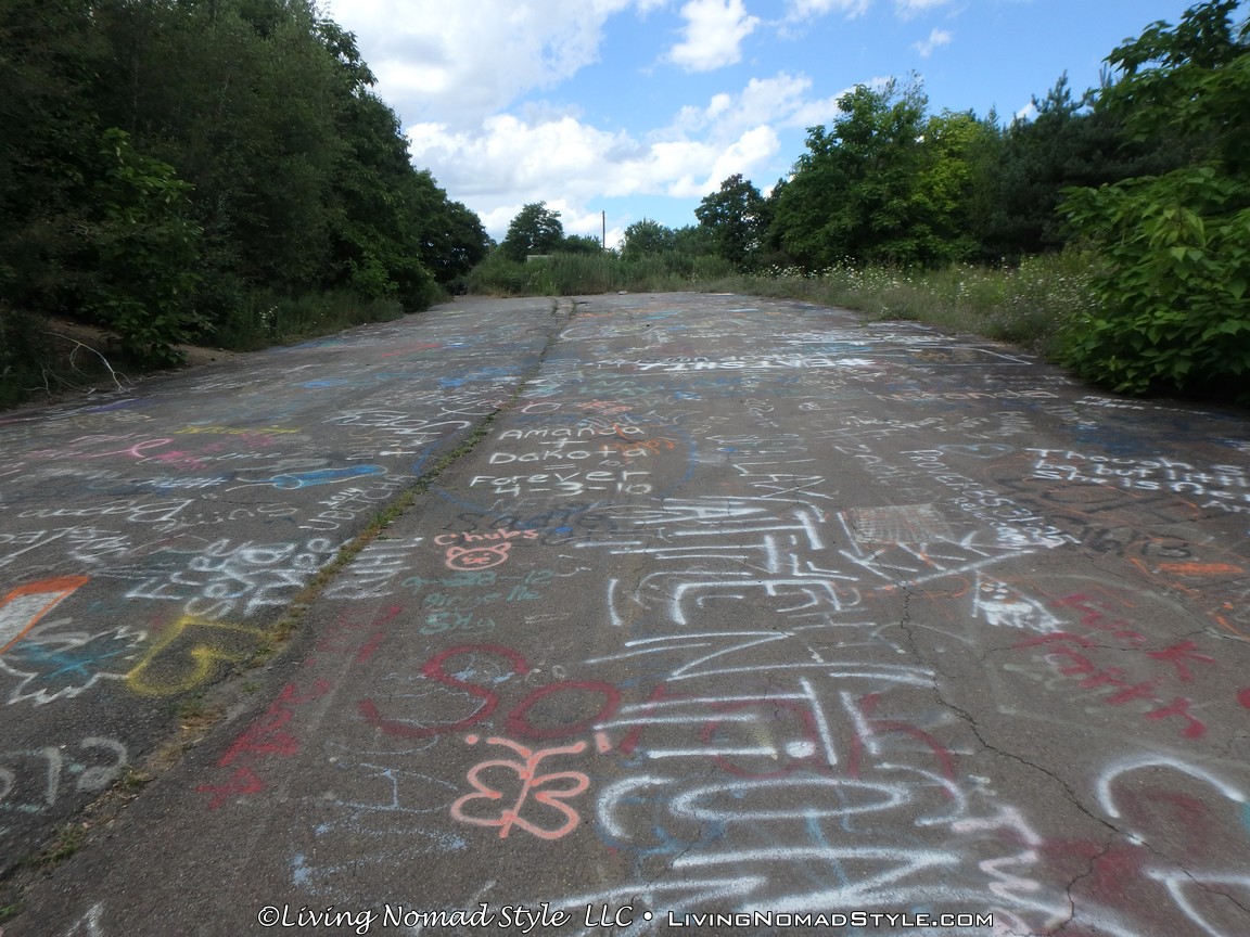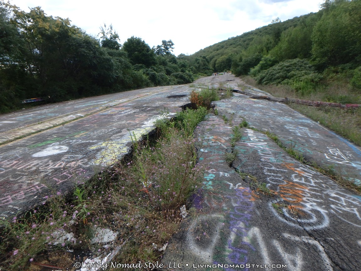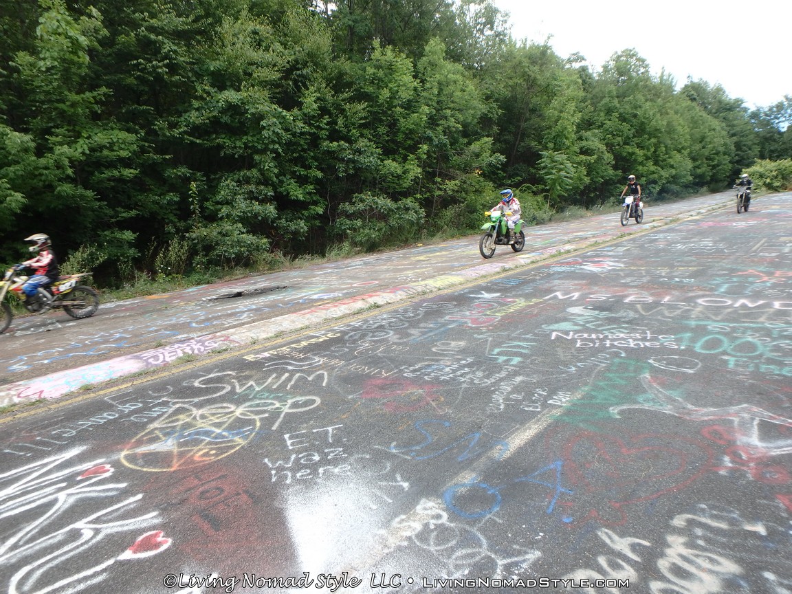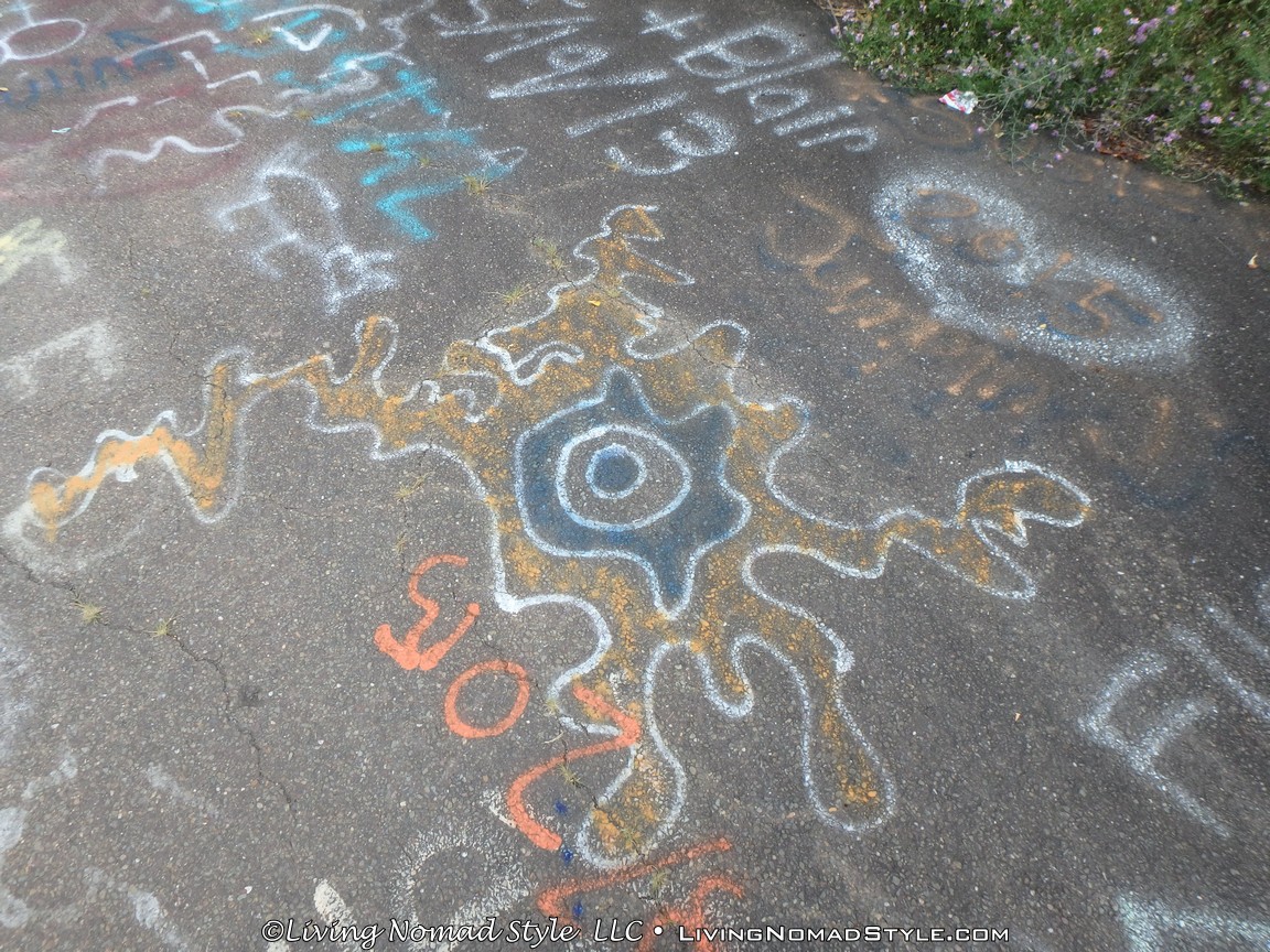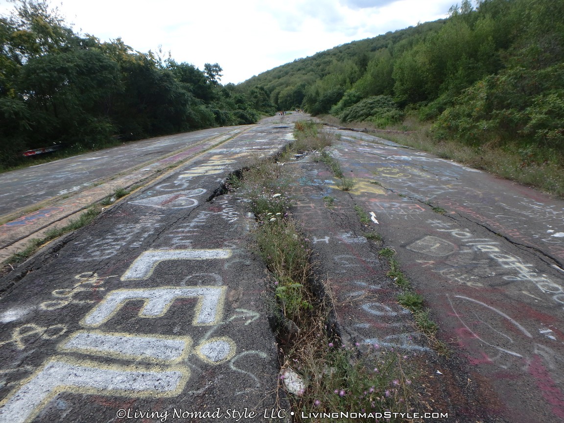 One section of the highway was closed off and traffic rerouted because the fires came up through the road and destroyed parts of it. Now, this stretch is known as Graffiti Highway. Why? Because, sometime after it was closed off, graffiti began to appear on it. Now, people come from far and wide to see it and others to participate in decorating it. It is on the south side of the town as you are heading to Ashland. You can pull over and park right by the north end of it. It has a graffitied yellow directional sign with a black arrow. You can’t miss it. You will see cars parked on both sides of the road. And, while you walk the abandoned piece of highway, be careful as ATVs, motorcycles and even trucks still drive down it. Take a look at some of what we found.