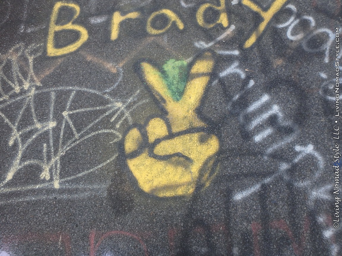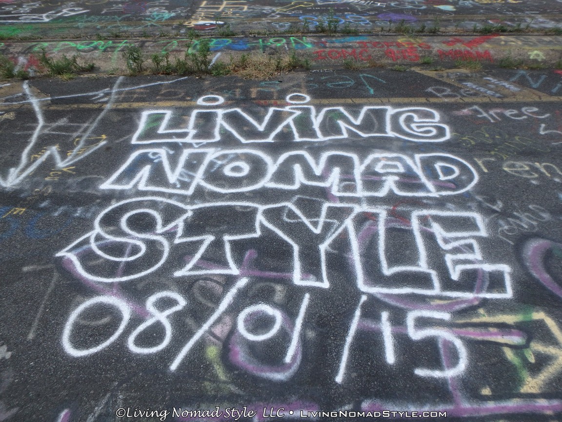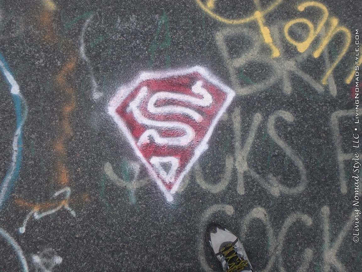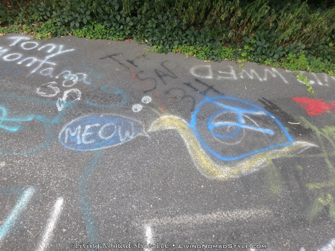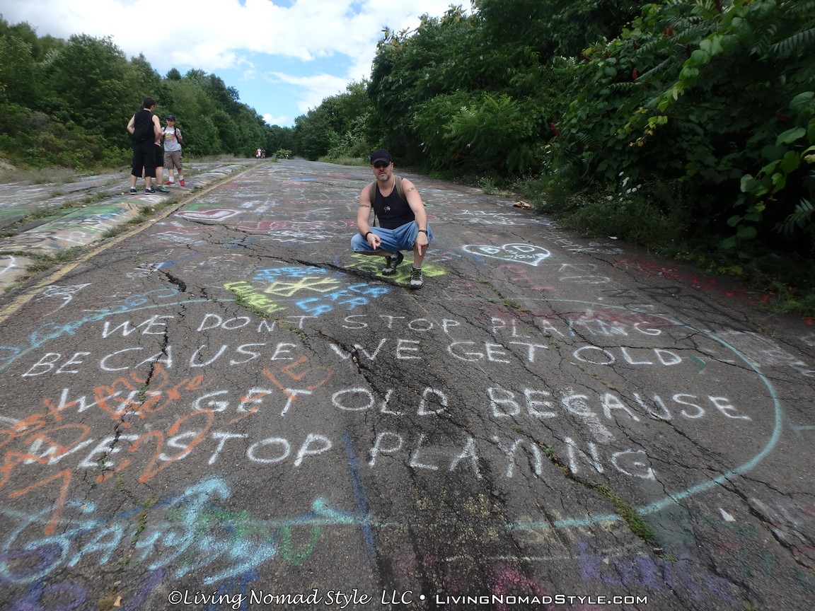 One section of the highway was closed off and traffic rerouted because the fires came up through the road and destroyed parts of it. Now, this stretch is known as Graffiti Highway. Why? Because, sometime after it was closed off, graffiti began to appear on it. Now, people come from far and wide to see it and others to participate in decorating it. It is on the south side of the town as you are heading to Ashland. You can pull over and park right by the north end of it. It has a graffitied yellow directional sign with a black arrow. You can’t miss it. You will see cars parked on both sides of the road. And, while you walk the abandoned piece of highway, be careful as ATVs, motorcycles and even trucks still drive down it. Take a look at some of what we found.