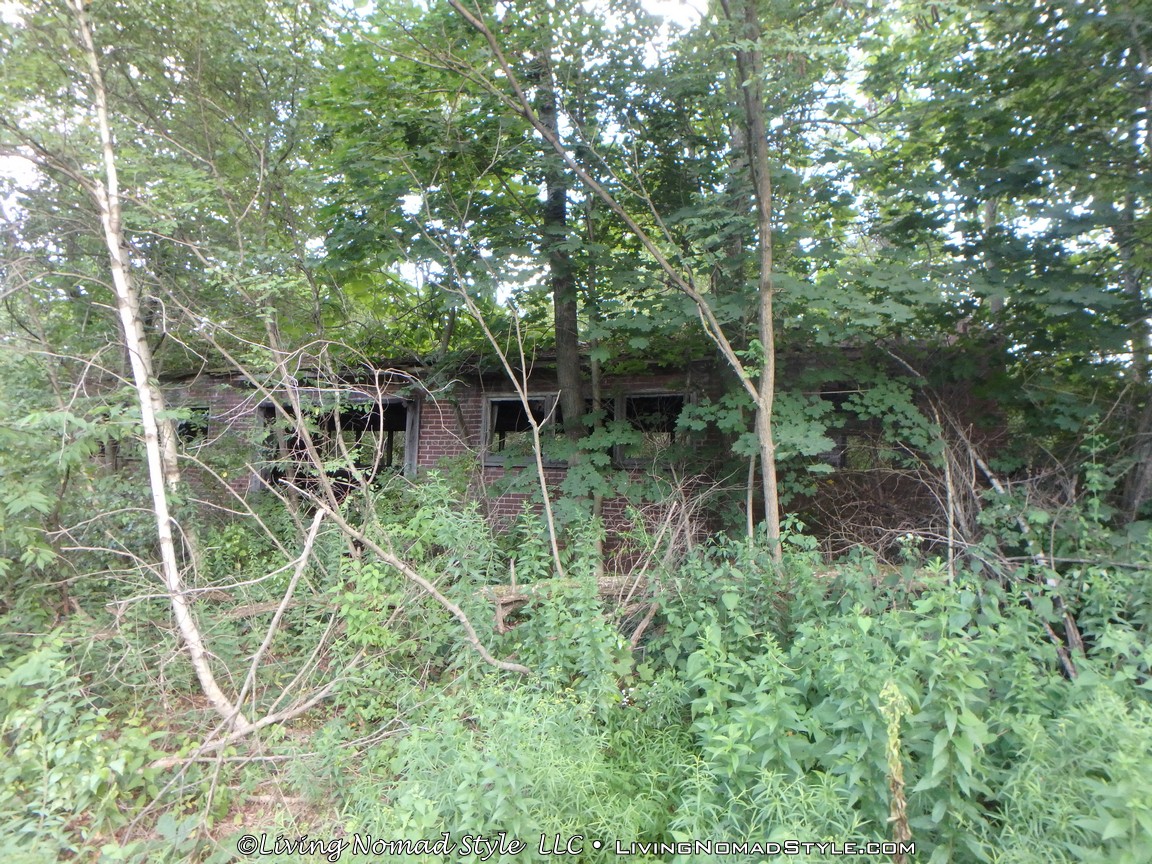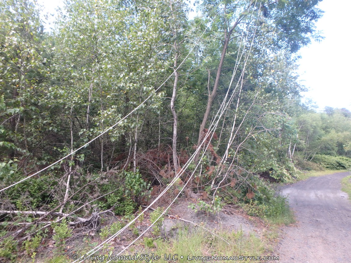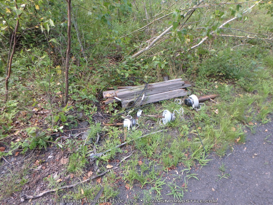 We did come to the end of one road that had a six to seven foot wall of rock and dirt pushed up to stop vehicles from driving any further. We parked and Noah and Trevor explored the area on the other side of the mound. We saw old power poles and miles of old electric line. Some still on poles. But most was either stuck in trees or on the ground. We hiked for a while finding bricks, concrete and other remnants of houses.