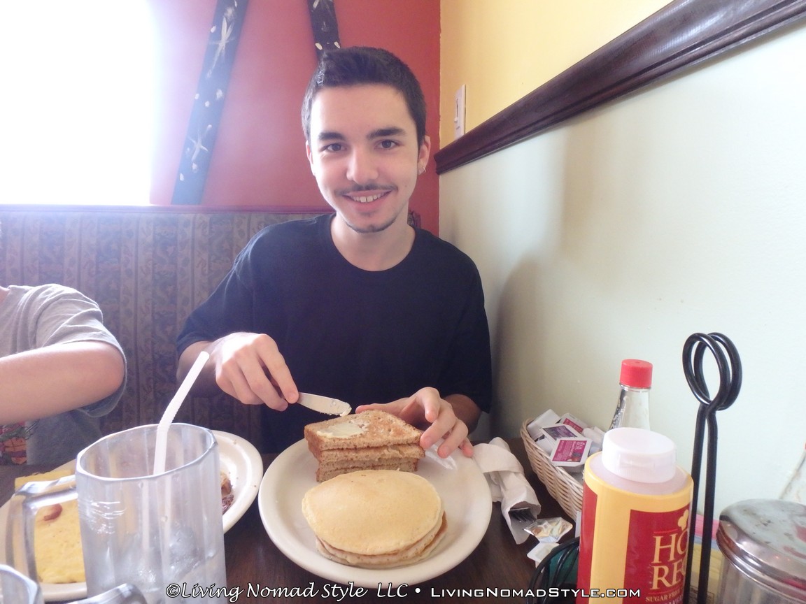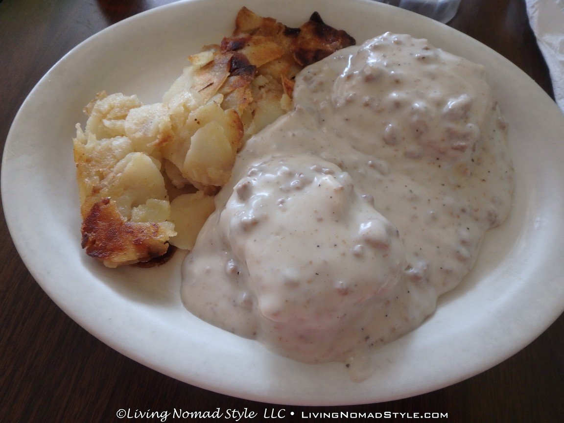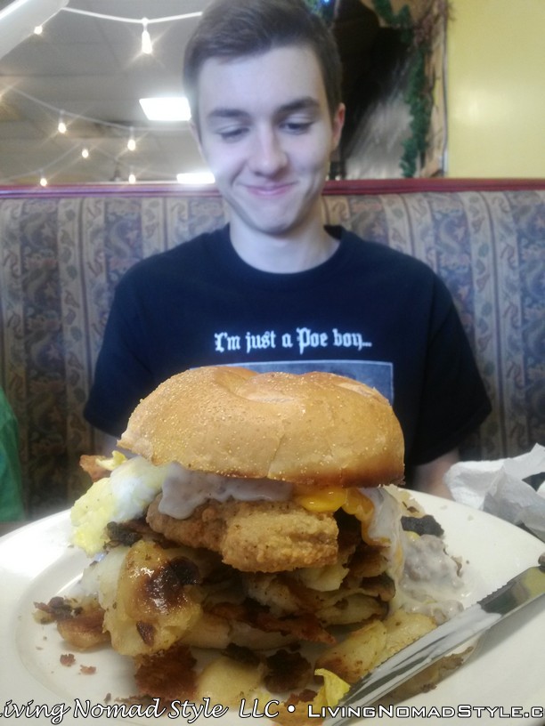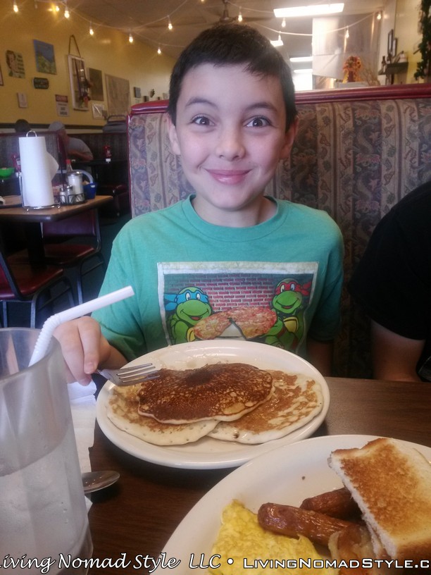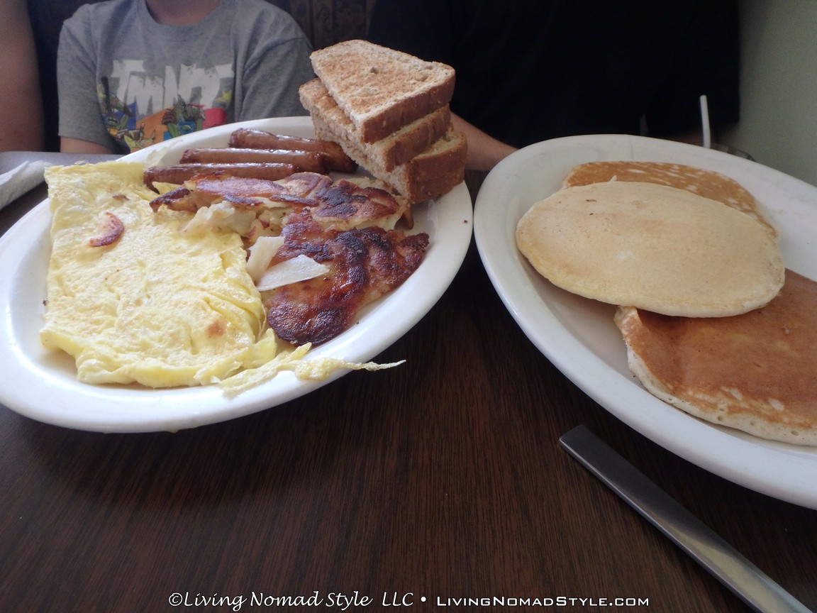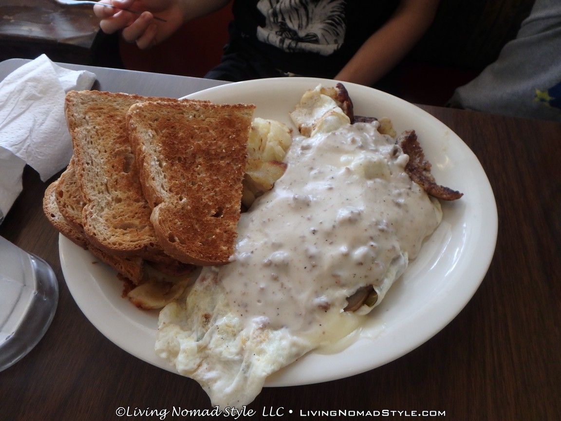 Their breakfast menu has a variety of items to choose from, and is sure to have something for everyone. They’ve got a large selection of omelettes (we’ve tried a couple, they’re great). There’s Hungry Man plates with eggs, bacon, sausage links, toast, AND pancakes. It takes a real hungry man (or woman) to put all that food away, and our middle Nomad son has done it each time we ate there. My favorite is their biscuits and gravy; it’s my perfect comfort food. Almost every breakfast dish comes with a side of homefries. If you are a potato junky (like me) you’ll love ’em. Best homefries I’ve ever had at a restaurant.