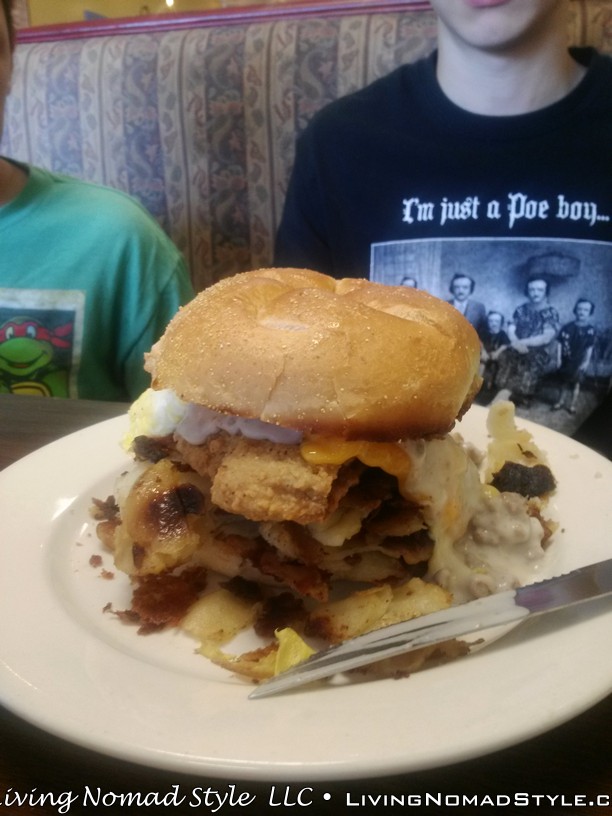 I’ve been saving the best for last. The most unique breakfast item that I’ve ever seen. Not for the faint at heart…..it’s the Belly Buster Messy Mike. This sandwich is the Goliath of all breakfast sandwiches. And I’m proud (or frightened) to say that the eldest Nomad son has put this bad boy away, not once, but twice. What can I say, my boys can eat. Just wait til you hear what’s in this baby; its two eggs, chicken fried steak, bacon, home fries, and cheddar cheese, topped with sausage gravy, all on a ciabatta bun. Lawdy, Lawdy this is the breakfast sandwich to beat all other breakfast sandwiches.
