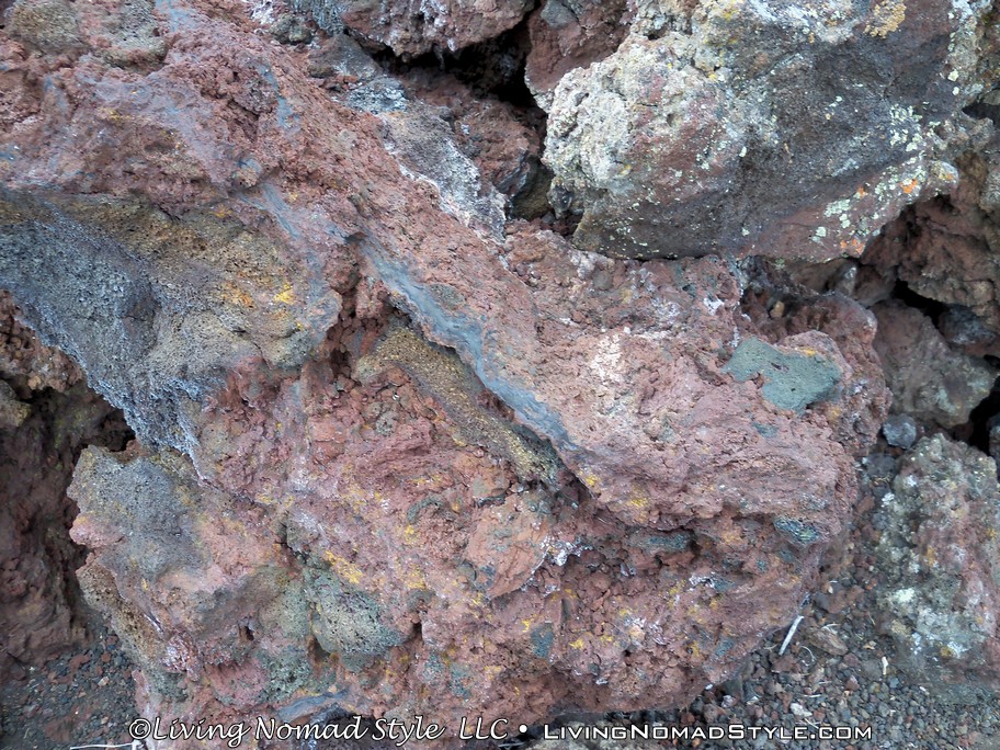 After you descend, you will take a short drive (like 1/10th of a mile) to 2 different cones you can see down in. The first one is just called Spatter Cone and the second one is called Snow Cone. Spatter cones, in general, are like small volcanoes that are formed when molten lava is thrown into the air and it lands forming a cone outside of the opening in the ground. So, technically, Snow Cone is also a spatter cone, but they named it as such because it looks like there is snow at the bottom of it. There were no signs saying what it actually is. It looks like snow but it is likely molten rock that hardened with a lot of metal content. Nonetheless, still looks cool.