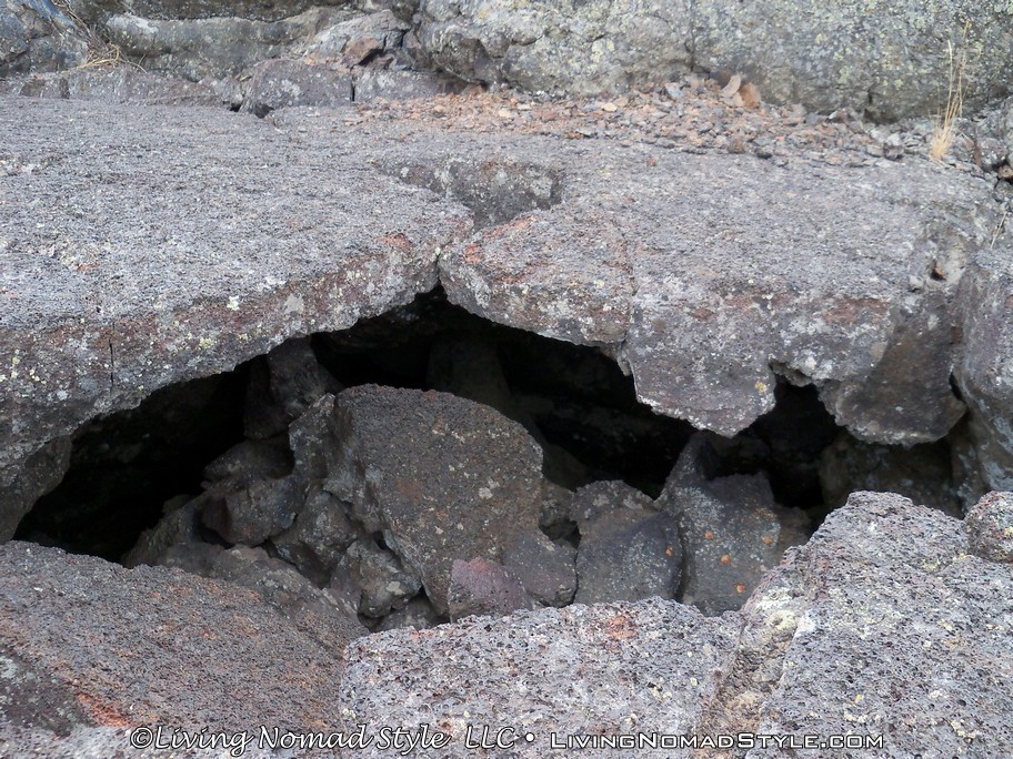 Indian Tunnel is a place that was used by the Shoshone for shelter, a source of water while traveling through the lava fields and, it is thought, that this also held sacred properties because of the stone circles outside of the mouth. You will come to some metal stairs that will allow you to descend partially, then you need to climb down rocks. If you decide to walk through the whole tunnel, you will exit about 800 feet away. There are a couple of huge holes in the roof, where the rocks collapsed at some point in the past, that will give you enough light to see through the whole tunnel. At the end, you will have to climb rocks at a rather steep grade and exit through a small opening. We explored one end and the other, but did not go through the middle of the tunnel because we heard bats and were worried about contamination.