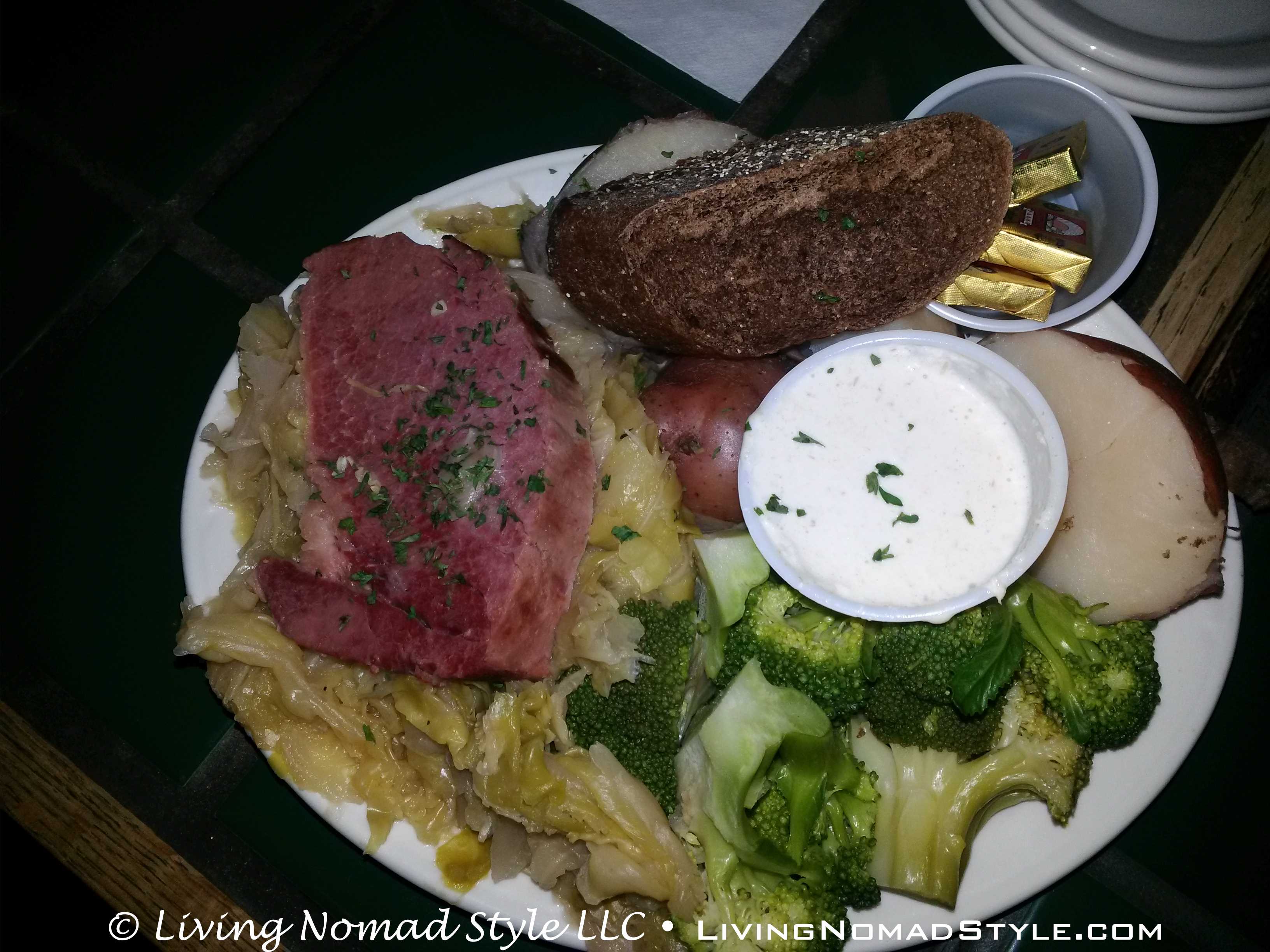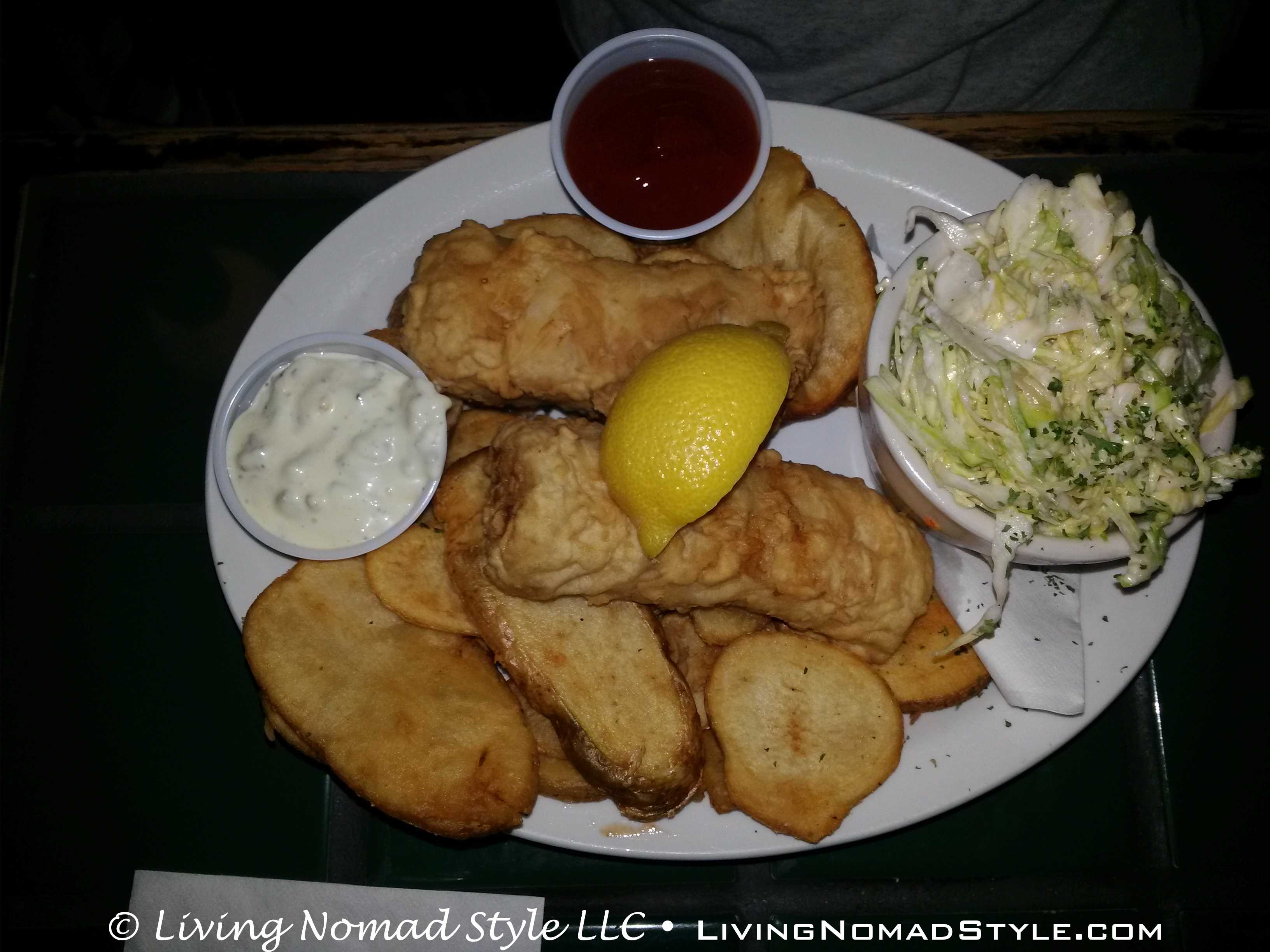 We ordered loaded potatoes for appetizers. They were delicious and they did not skimp on the toppings. For the main course, the boys ordered Shepherd’s Pie, Fish and Chips and a Smoked Turkey sandwich. Mama Nomad ordered Corned Beef and Cabbage. And I ordered Bangers and Mash. Let me tell you, I think I have found a new favorite Pub dish. The flavor of the food was great all around.