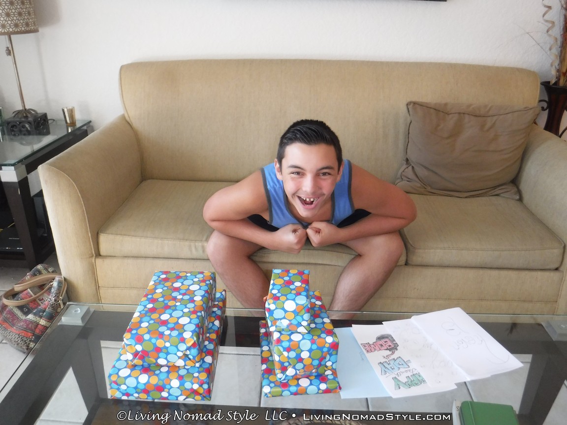 After breakfast, at 11am (more like brunch), Trevor read cards from family and opened presents. It is a tradition that each of us make handmade cards. Even down to the youngest Nomad, it really seems like the effort is appreciated.