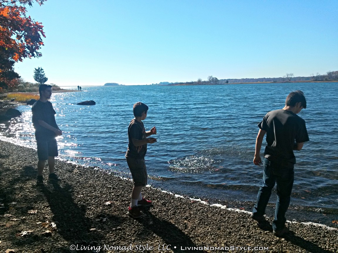Another stop we had on our “Homeschool Days Out” was to Bluff Point Coastal Reserve; also located in Groton, CT. Bluff Point is a great place to spend an afternoon in nature. We enjoyed our time hiking on the wooded path; with a few breaks away for the boys to skip some rocks, and climb some trees. Bluff Point is a peninsula that runs along the CT coastline. It is one and a half miles long, and one mile wide, giving a 4.5 mile loop to enjoy. While we didn’t have the time to do the whole loop during this visit, I hope we’ll make it back to complete the entire hike soon. The water is clear, and lovely with fish literally jumping. The woods are full of large trees, and huge boulders; perfect for climbing around. Across the water is a small airport for private use. It can take away a little of the peace, and quiet with the planes coming, and going. It was no bother to us though. We enjoyed watching the planes take off, and land.