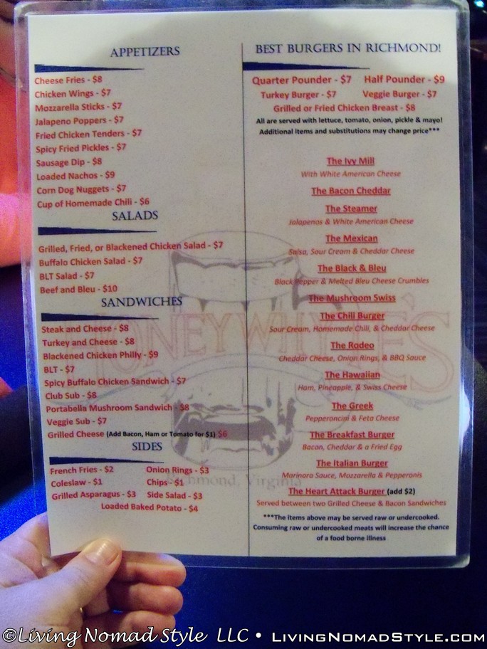 After an afternoon and evening exploring Downtown Richmond, and with a 2 hour drive back to homebase in front of us, we decided to visit a local place and grab a bite to eat. The vote was for burgers. We were by St. John’s Church, where Patrick Henry delivered his famous “Give me liberty or give me death” speech. So we fired up Yelp and found a local burger joint with good reviews that wasn’t far. So we jumped into Ebony and headed to Honey Whytes.