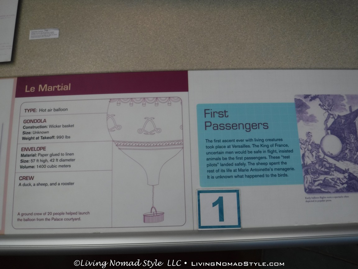 When you enter the museum, it opens up into a two-story open view with a blimp and balloons of all shapes and sizes in the background. The git shop is immediately to the right. You will want to go straight. This is where it begins the story of the flight of the first hot air balloon. It was September 19, 1783. The King of France, King Louie XVI, was worried about the safety of men in this new contraption, so he insisted on farm animals. So, the first animals to fly in a hot air balloon were a duck, a sheep and a rooster. Don’t worry, the animals landed safely.