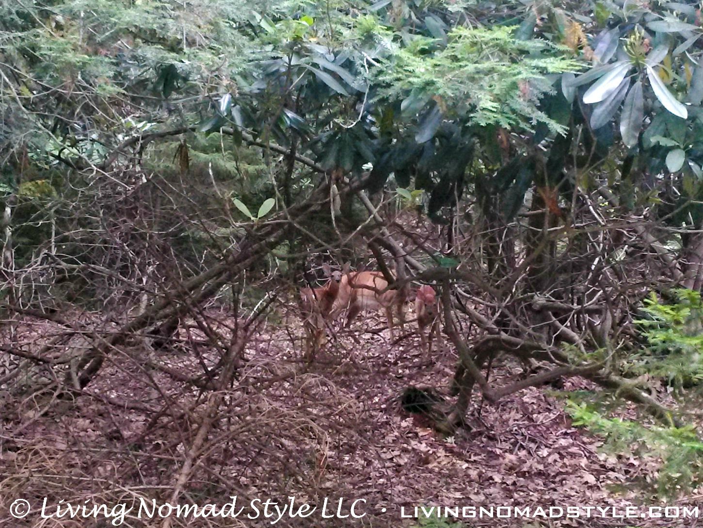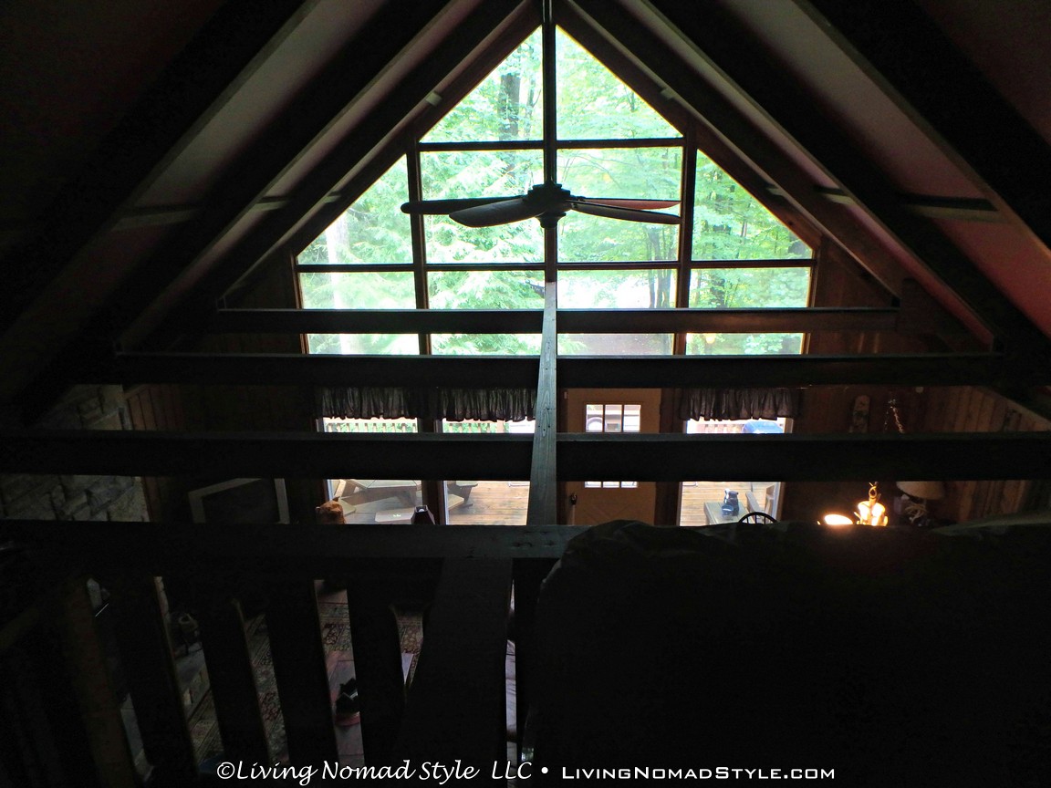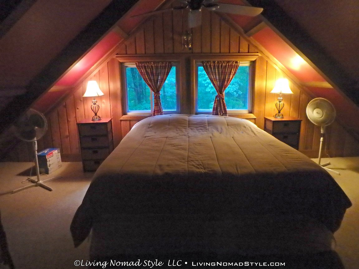 When you ascend the final staircase, you enter a loft bedroom. Watch your head as the ceiling inside follows the roof contour. This area is perfect for a good nights sleep. The bed is one of the most comfortable that I have ever slept on and the area in the loft bedroom is dark. When you wake up in the morning, you can look out of the two stories of windows on the front of the cabin or look out one of the back ones to see the field of ferns in the forest. And you may even catch mom and the twins out there. That is the name we gave to a mama deer and her two fawns.