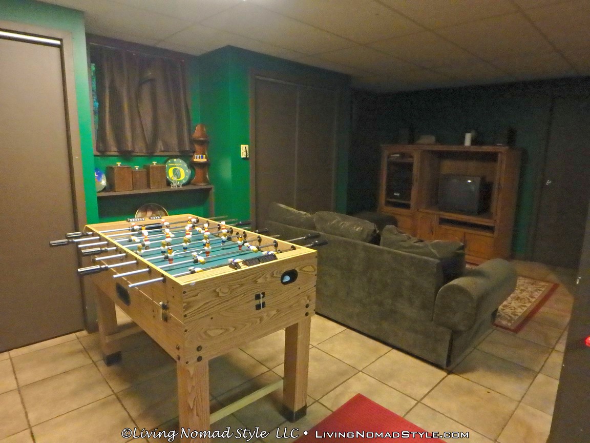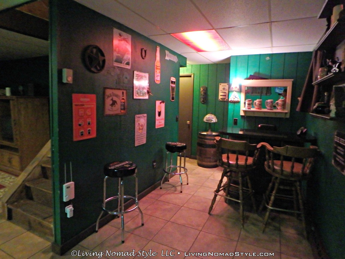 The cabin itself is 3 stories tall! The lower level, which is ground level but for some reason we kept calling it the basement, is the entertainment level. It has an actual pool table and Foosball table. That level also features a bar, and a much needed bathroom to accompany that amenity. To round it out, there is a sitting area with a couch, and an entertainment center with a TV.