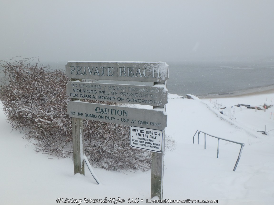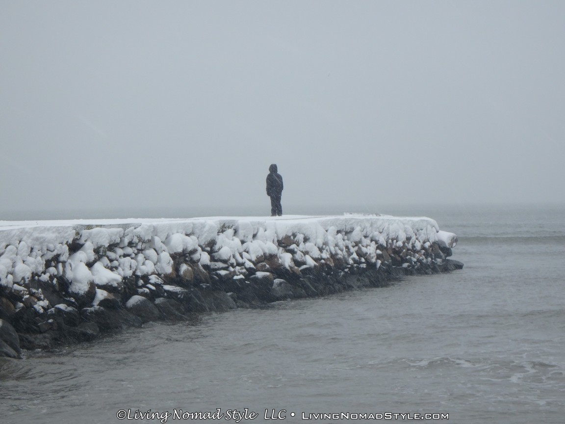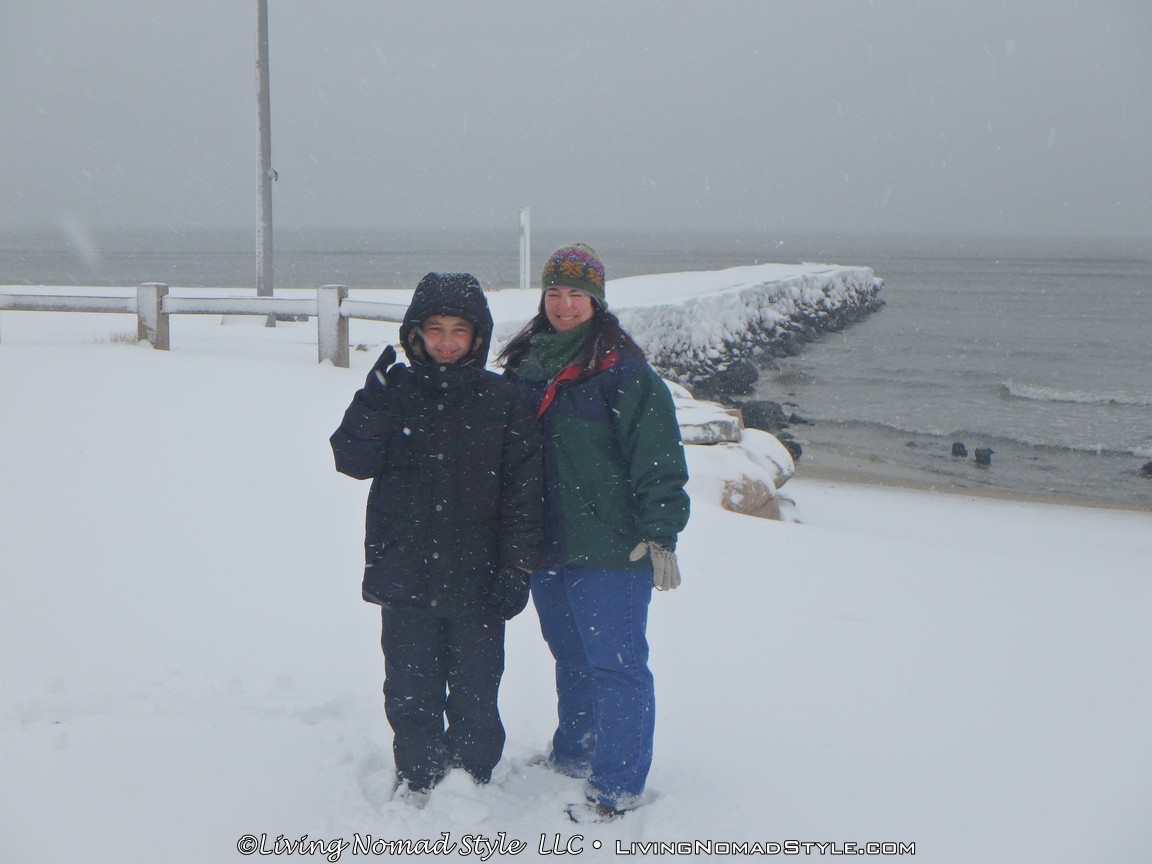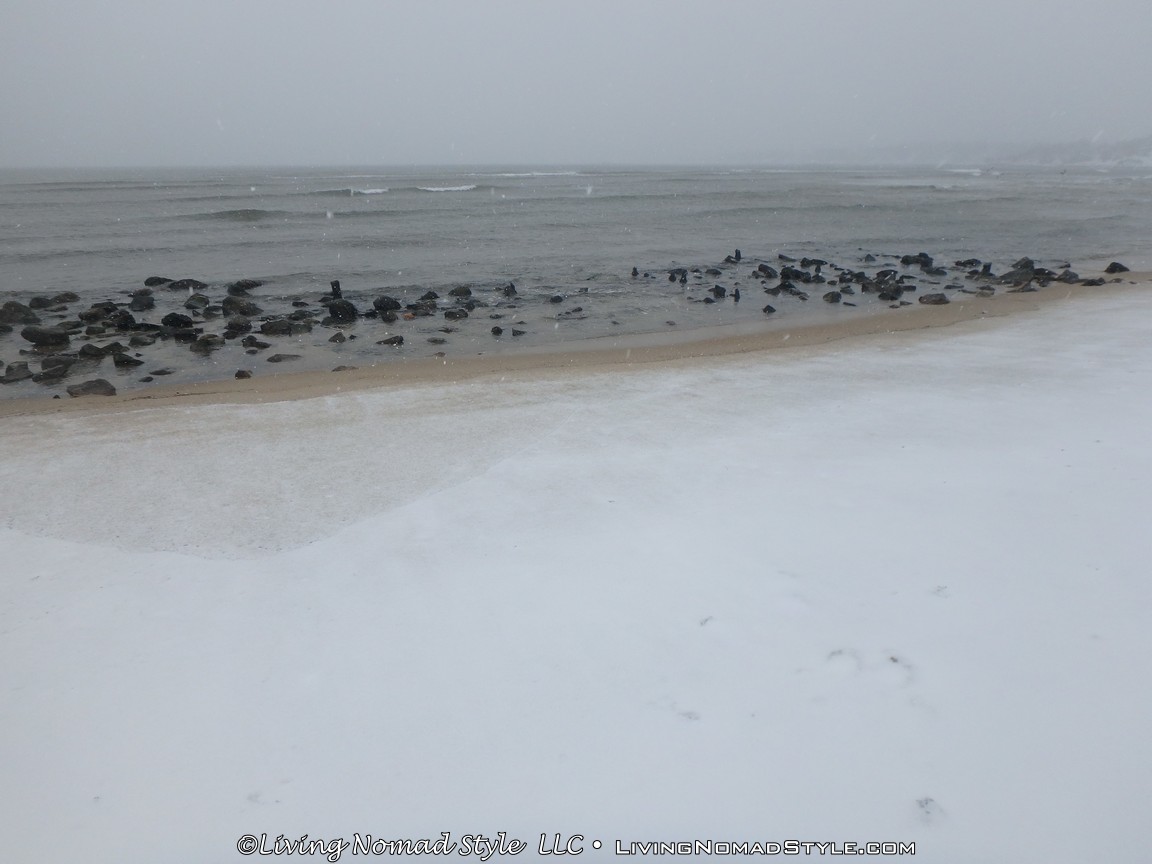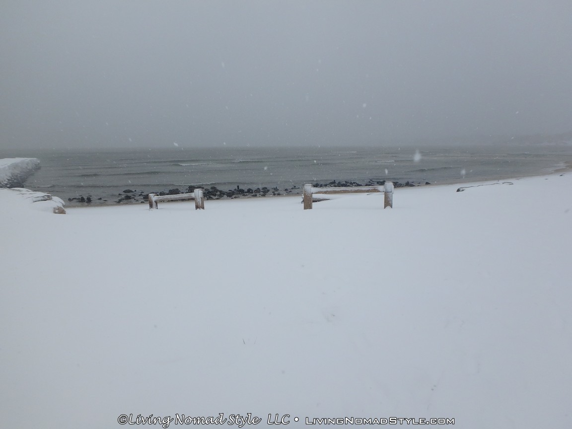 We were not content with watching it from behind glass. We are a block from the beach. We have been to the beach before. We have been out in snow before. But we have never been to the beach while it was snowing. So, Mama Nomad, Trevor and I got our gear on and headed outside.
