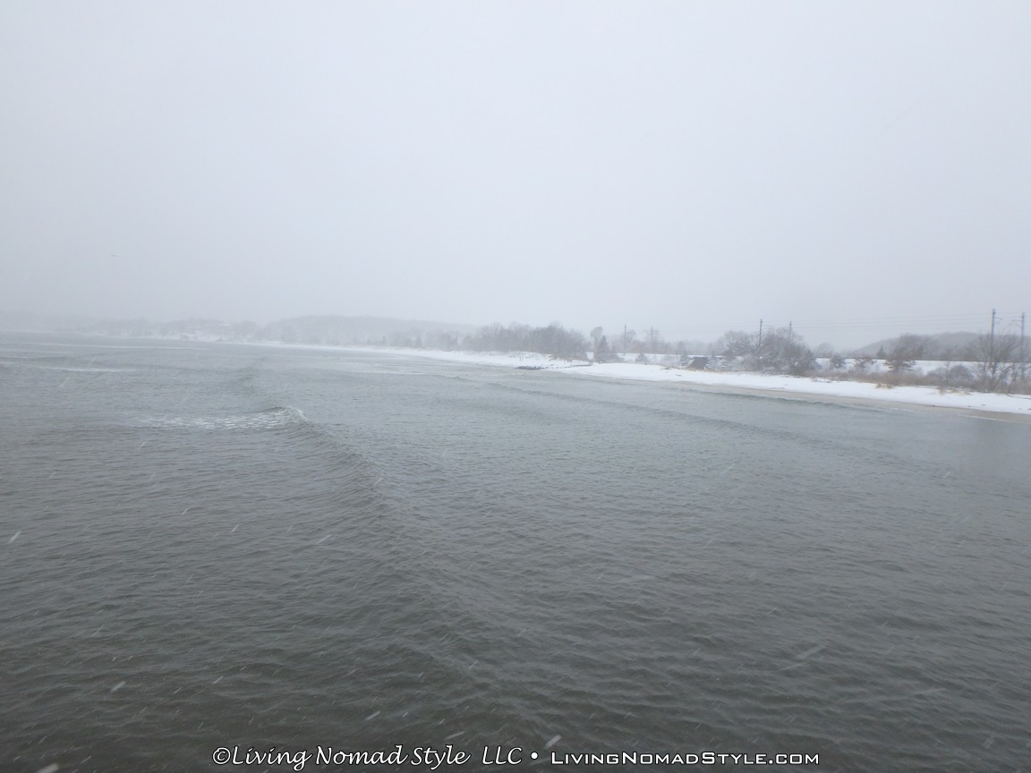 While out and about we encountered a man and his dog playing in the snow on the beach. The dog was chasing the seagulls making them fly around overhead. That is something we never do. They can get angry, fly over and bomb you with poop! We also saw a dad pulling his son down the beach, across the snow on an inner tube. The kid was traveling in style.