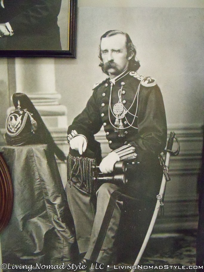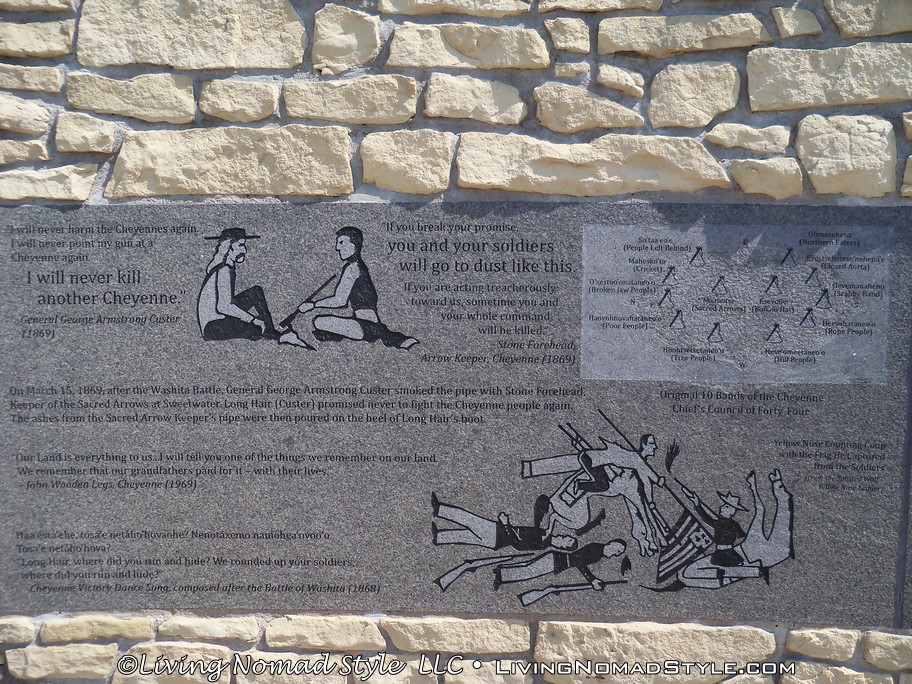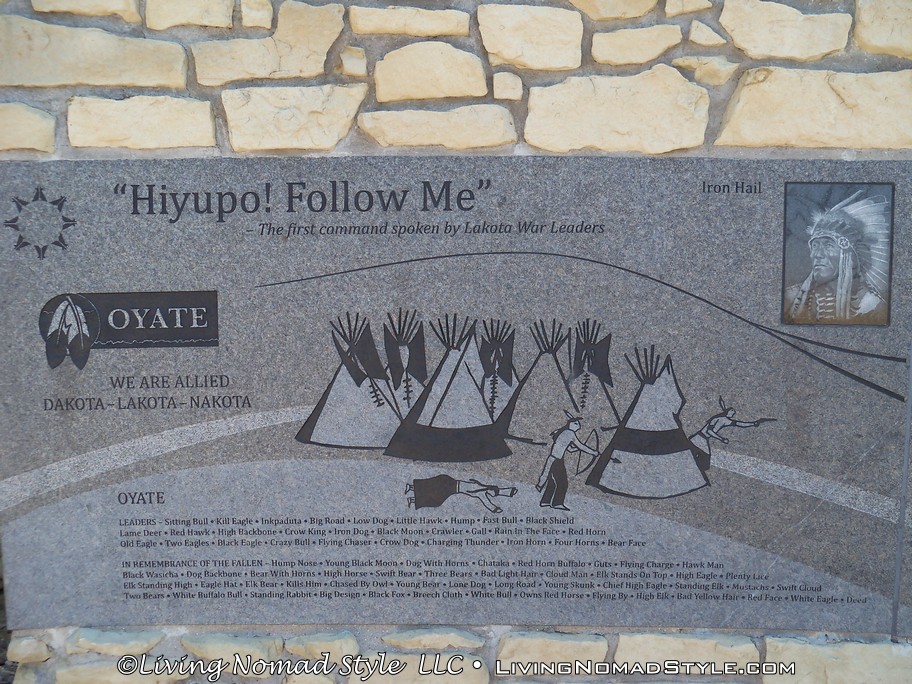 Beyond that is a structure called the Indian Memorial. This memorial gave a history of all people and factions that were involved in the battle. Enos Poor Bear, Sr., Oglala Lakota Elder said, If this memorial is to serve its total purpose, it must not only be a tribute to the dead; it must contain a message for the living…power through unity… When you walk into the structure, you will see a metal sculpture depicting Native Americans on horseback. But, all around the circular memorial are engravings on the stone walls that give information about the Arikara, Apsaalooke, Arapaho, Cheyenne, Custer (more on this in a minute), Oyate and more.