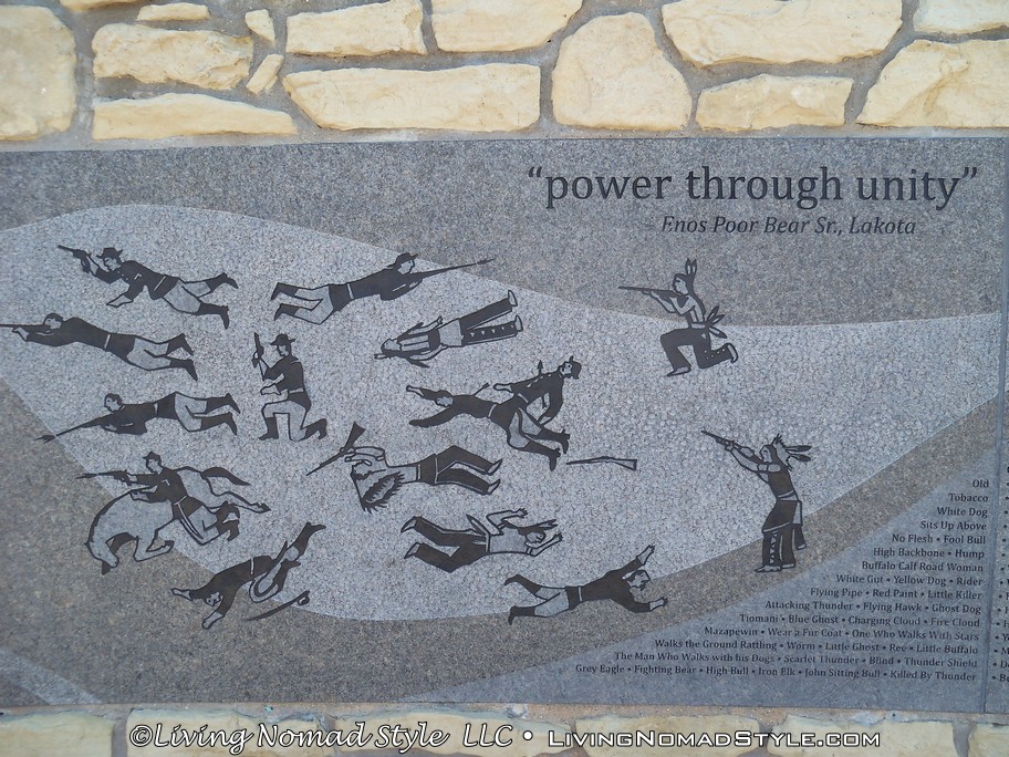 Beyond that is a structure called the Indian Memorial. This memorial gave a history of all people and factions that were involved in the battle. Enos Poor Bear, Sr., Oglala Lakota Elder said, “If this memorial is to serve its total purpose, it must not only be a tribute to the dead; it must contain a message for the living…power through unity…“ When you walk into the structure, you will see a metal sculpture depicting Native Americans on horseback. But, all around the circular memorial are engravings on the stone walls that give information about the Arikara, Apsaalooke, Arapaho, Cheyenne, Custer (more on this in a minute), Oyate and more.