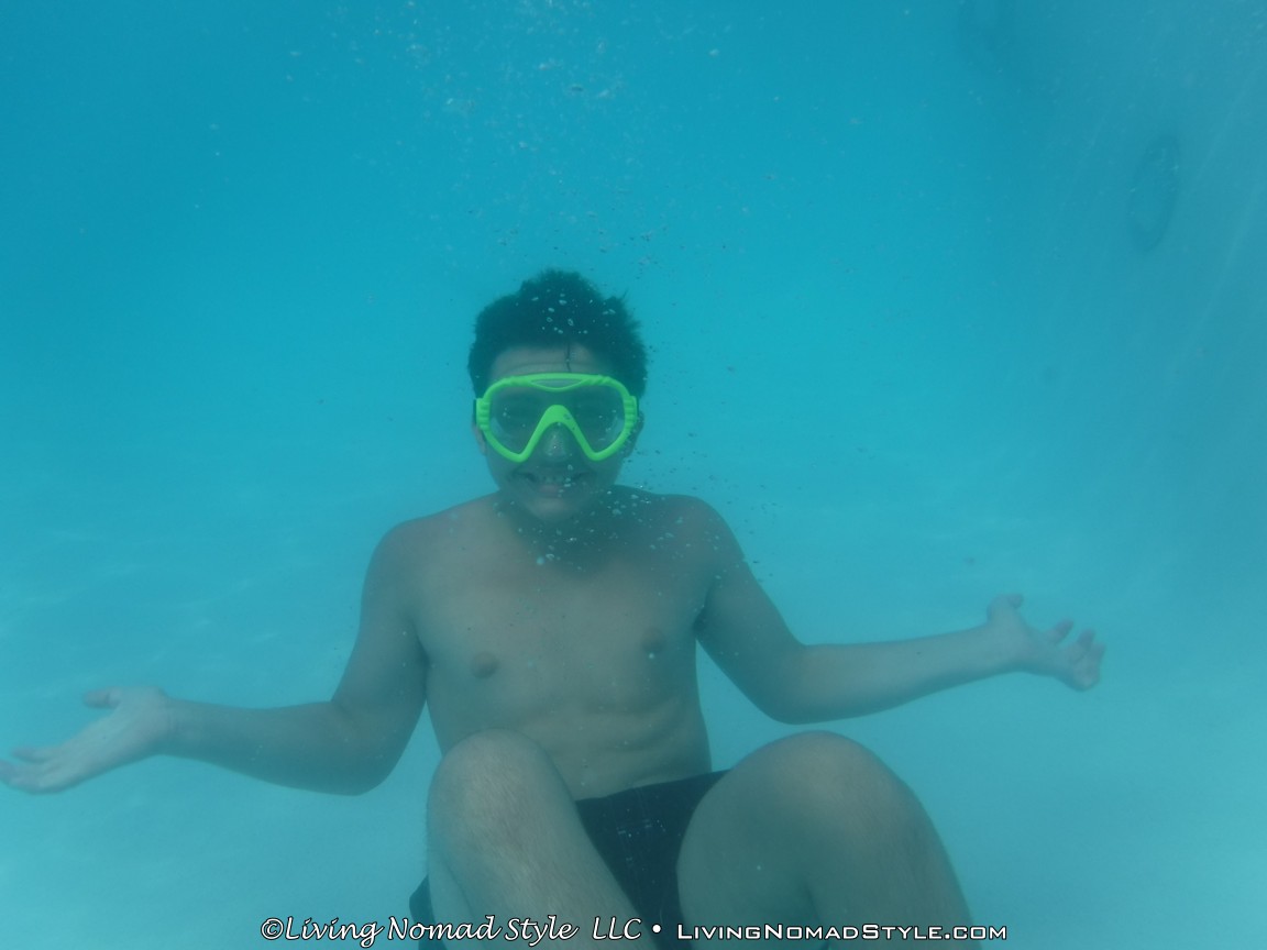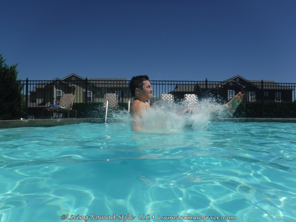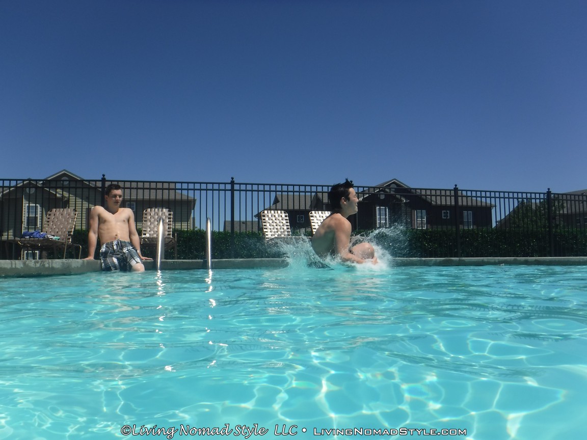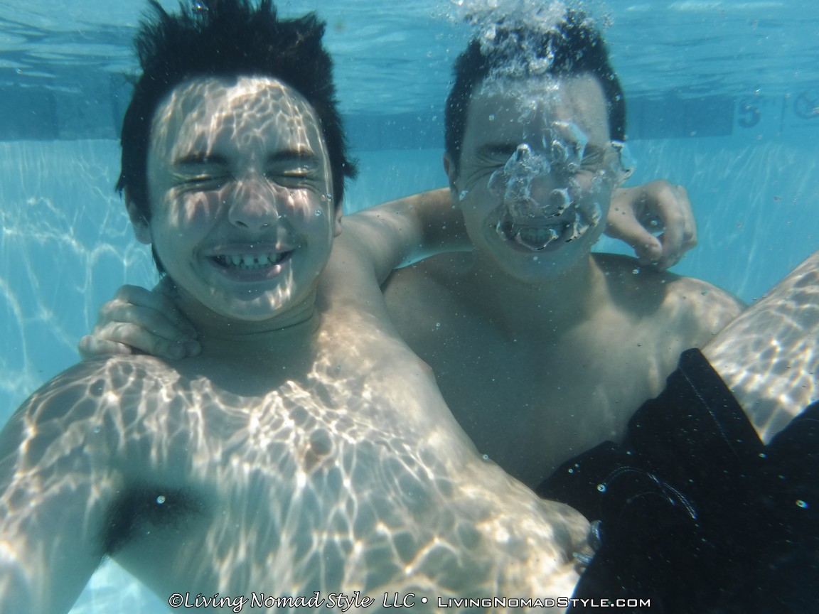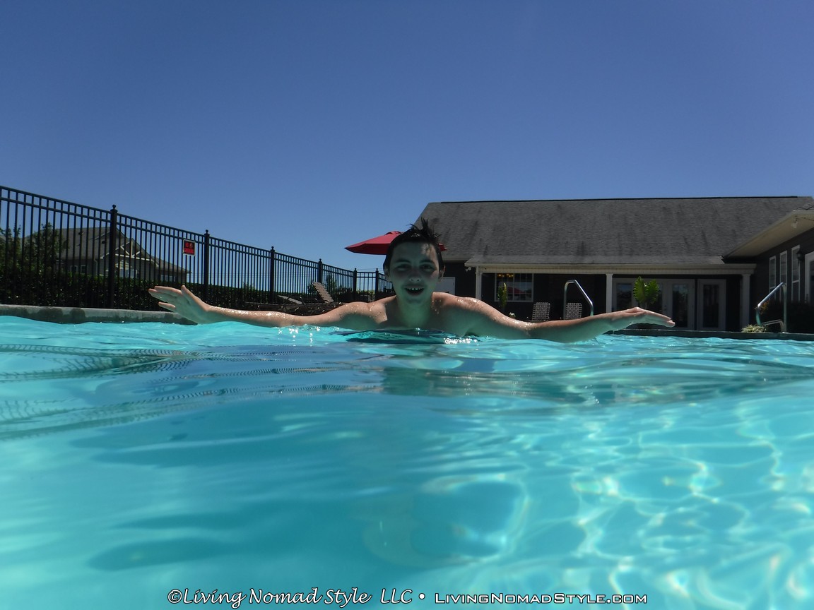 The party was at a club house with a great little pool adjacent to it. We showed up early to help out with the decorations. Then, when “most” of it was complete, I went to the pool with 2 of the 2 Nomad Sons. It was sunny, the sky was clear and a wonderful time to go swimming. I also had the opportunity to test out the waterproof capabilities of our rugged and underwater camera. Turned out pretty great.