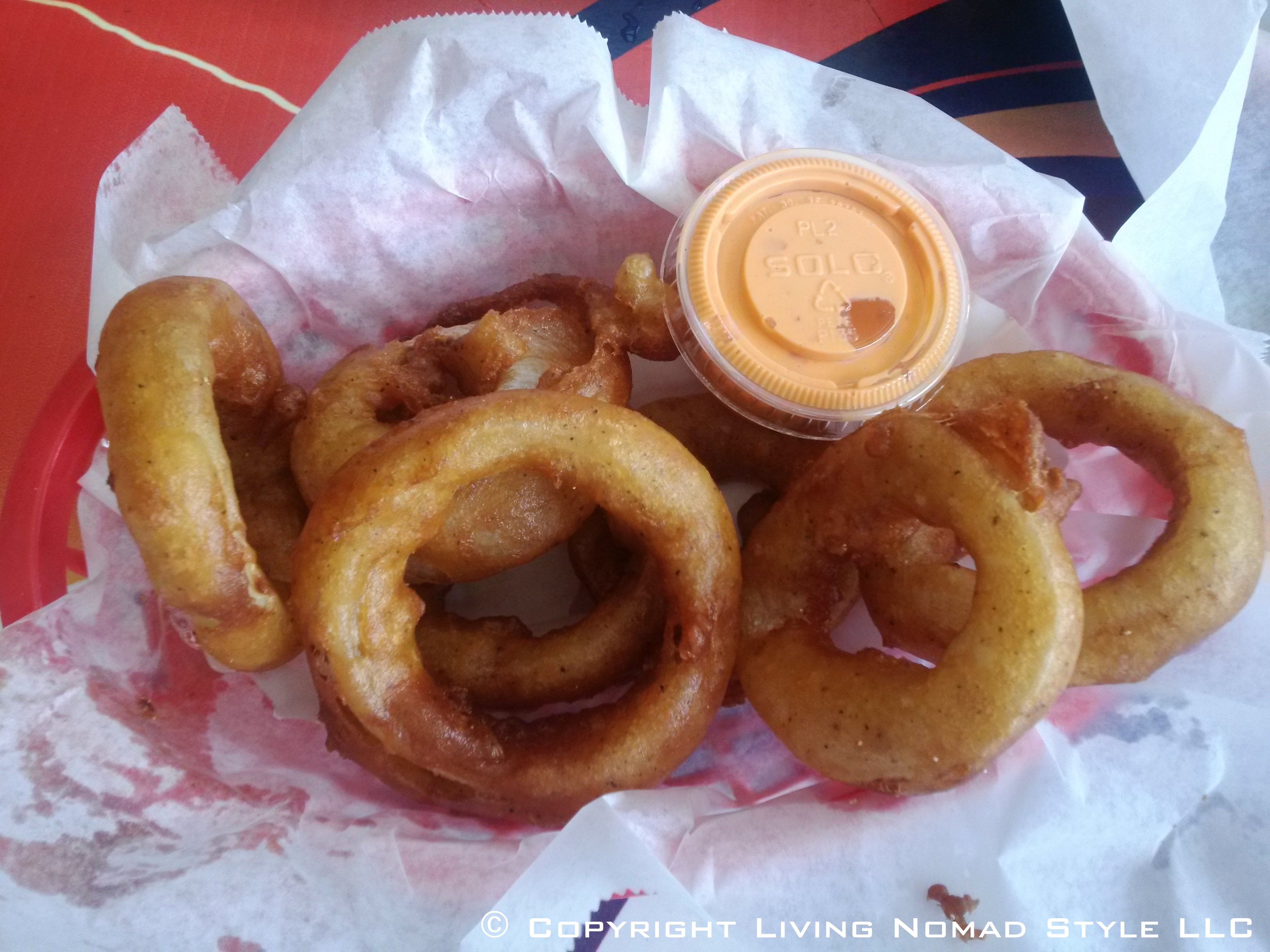 Shortly after we finished our Maryland Style Crab Balls our main dish arrived. As I stated, we asked them to cut them in half. The cut in half hot dogs came in 1/2 sized containers. I guess we were not the first to make such a request. They fit three halves of a foot long hot dog onto each plate along with a couple of wet naps. A basket of onion rings accompanied our order. They were huge. I am glad we did not order the large.