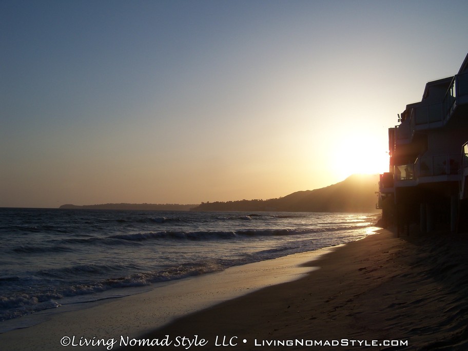 With a full belly we decided to get out of the city and head towards the beach. Which one? Malibu. So, we took PCH (Pacific Coast Highway) from Beverly Hills to Malibu Beach. We just enjoyed a relaxing drive down PCH after a hectic day in the city. When we reached Malibu, we deviated off of PCH and onto Malibu Road. This is a road that runs parallel to PCH and to the beach. It was quiet and without any real traffic. We found a place to park and walked down between some beach front houses to the beach. We got there just in time to enjoy watching the sunset. Great timing.