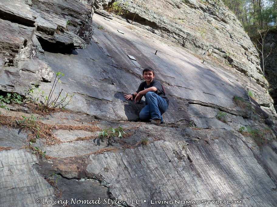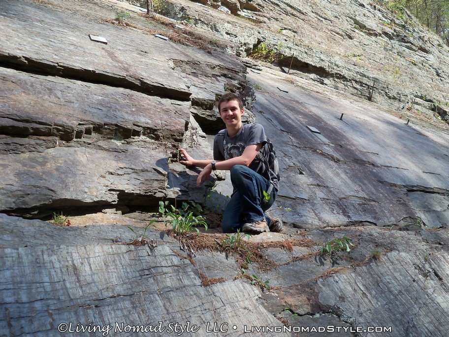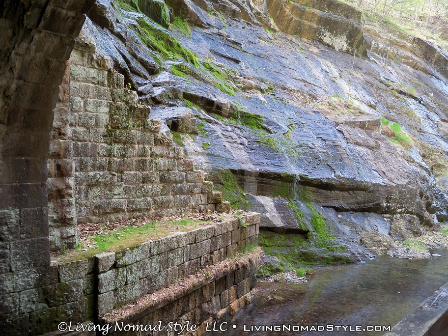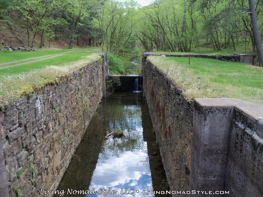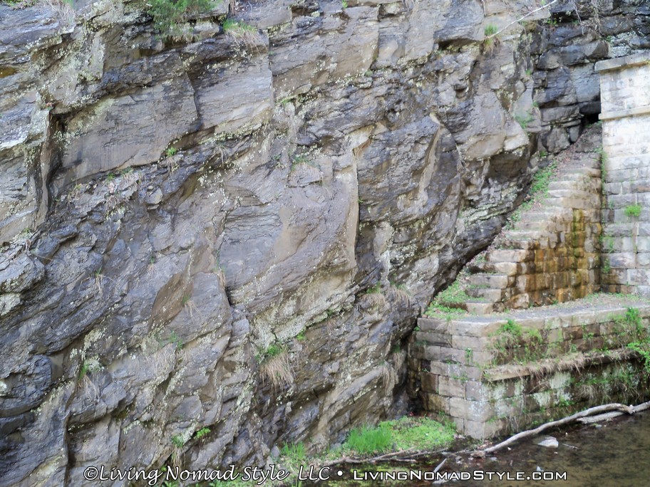 When we exited the East Entrance, we were met with a wooden boardwalk with tall rock walls which had water running down them and bright green moss growing. Eventually this boardwalk led back on to a regular trail. We continued on until we saw one of the canal locks. We explored it, took some time off and skipped a few rocks in the canal and headed back. This time, we chose to go over the mountain instead of through it.