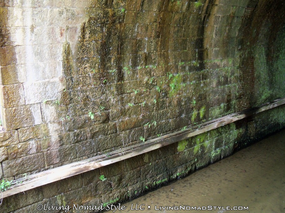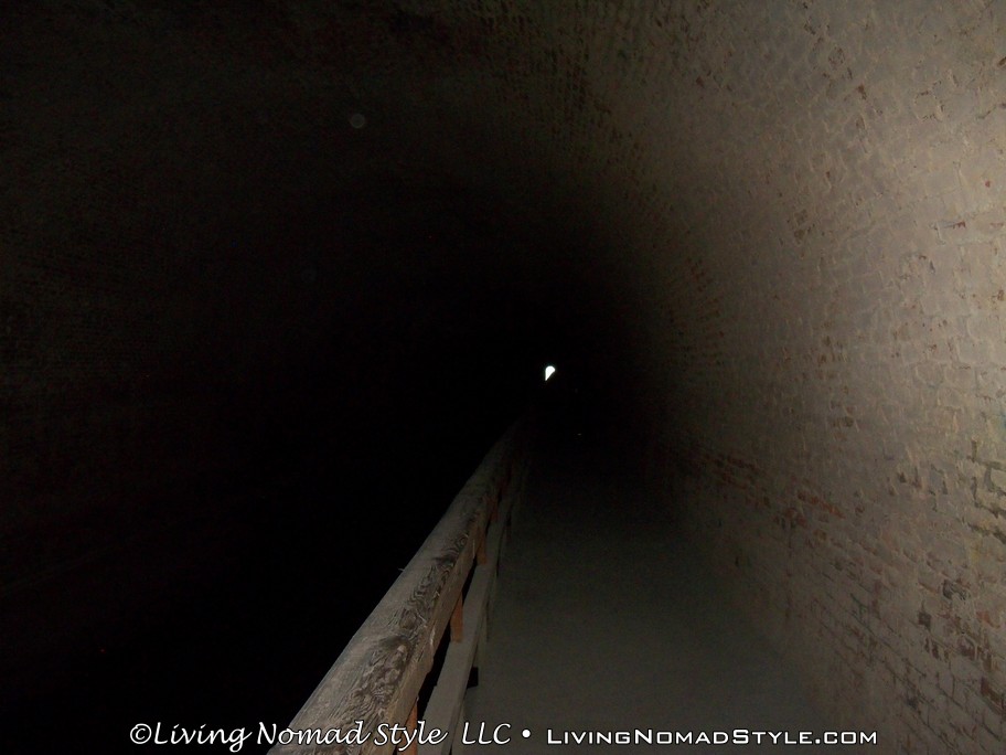 The tunnel entrance is straddled by stone stairs on both sides. And as we traversed through the over 3000 foot long tunnel, we noticed that it was constructed entirely of brick. Every so often you could see, if you have a flashlight, survey markers anchored into the walls. At some points you could hear water coming through the bricks overhead and, at some points, it even lightly rains water on you if you walk on the wrong side of the path. To anyone who is afraid of the dark, take note, you can see both ends of the tunnel 100% of the time.