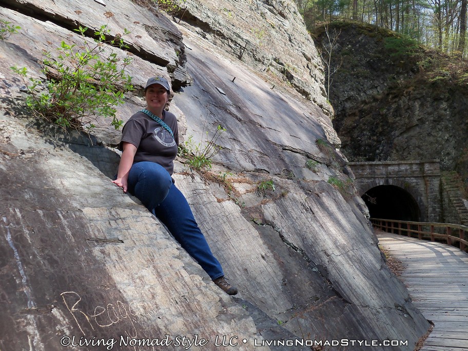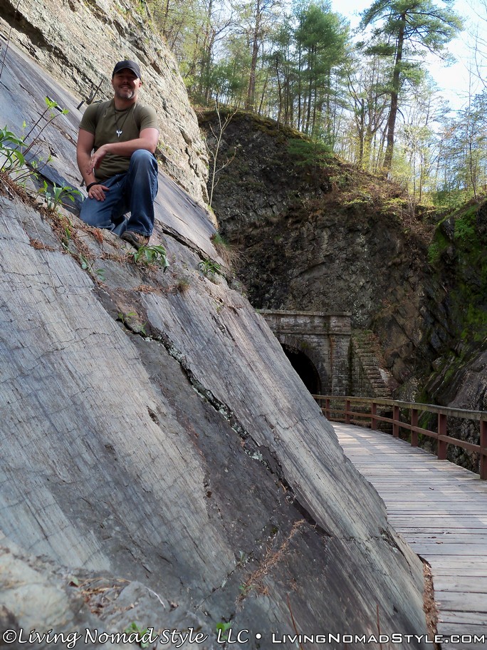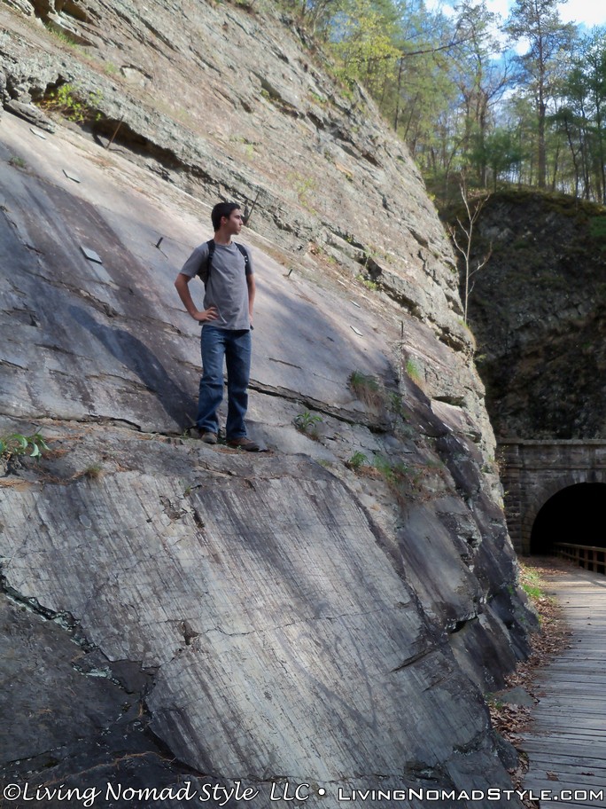 There is a trail head just off of the parking lot. Walk up and head to the right. In about 1/2 a mile or so you will see the West Entrance to the tunnel. At this point you can choose to go forward through the tunnel or head to the right, which is a path that goes up and over the mountain. We chose to go on through, of course.