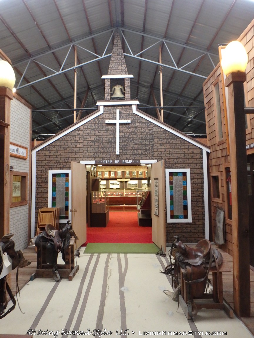 The museum is located on 13 acres with 13 buildings and over 38,000 square feet of display area (so expect a lot of pix in this post). The facades of the buildings seemed to fit the theme of when Cowboys and Native Americans rode the range. The grounds were nicely kept. And the main entrance clearly marked.