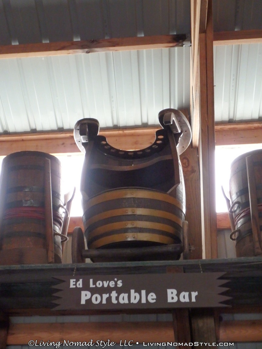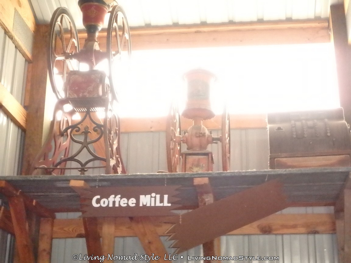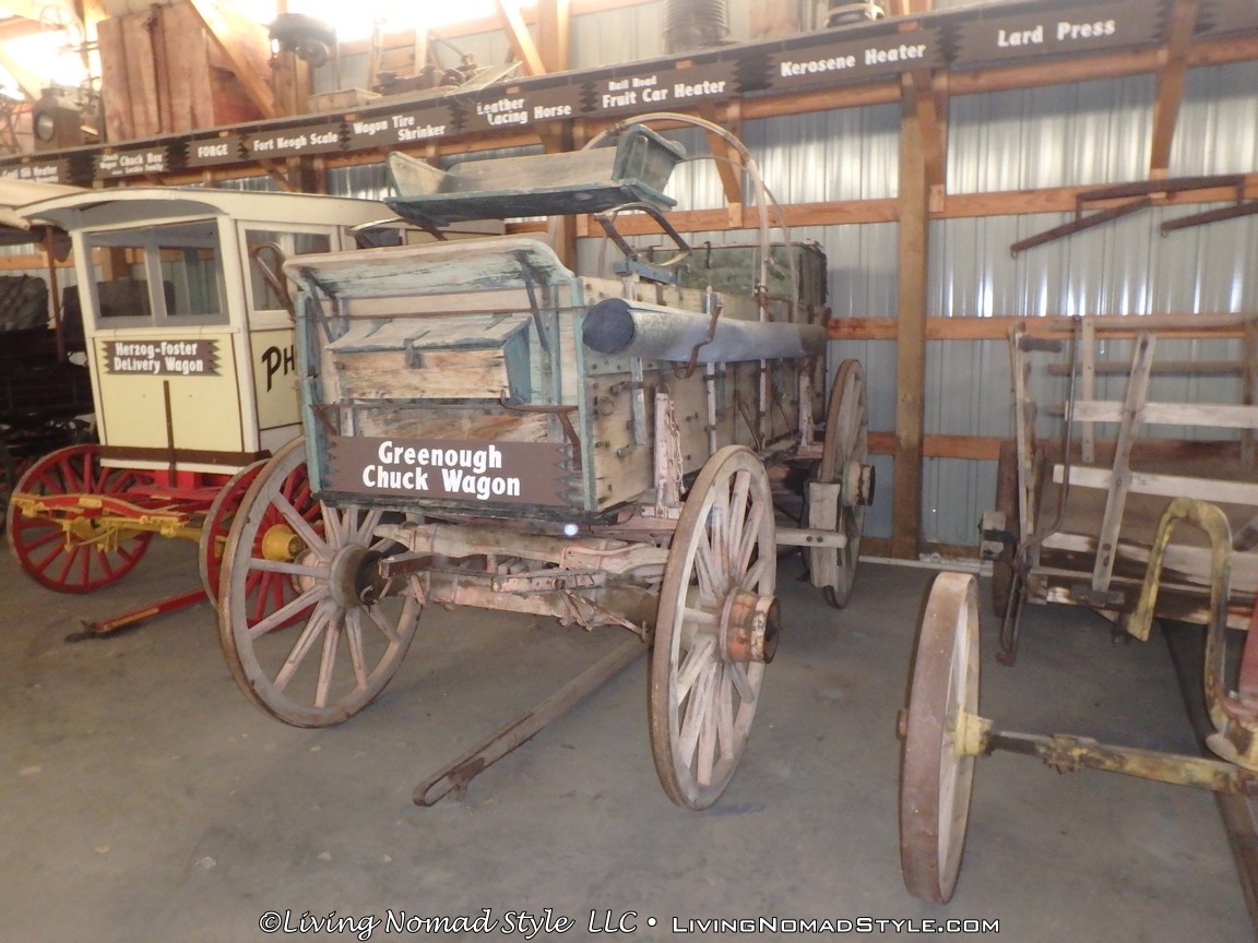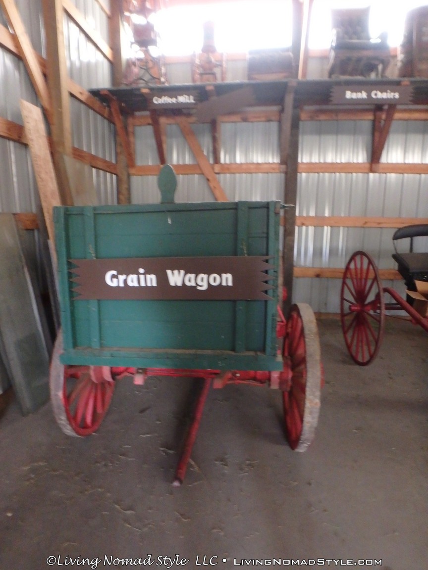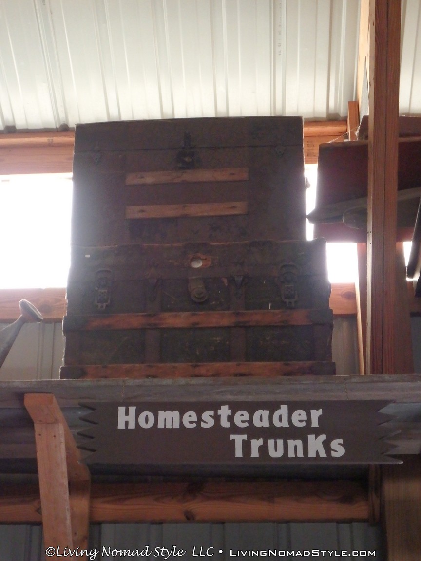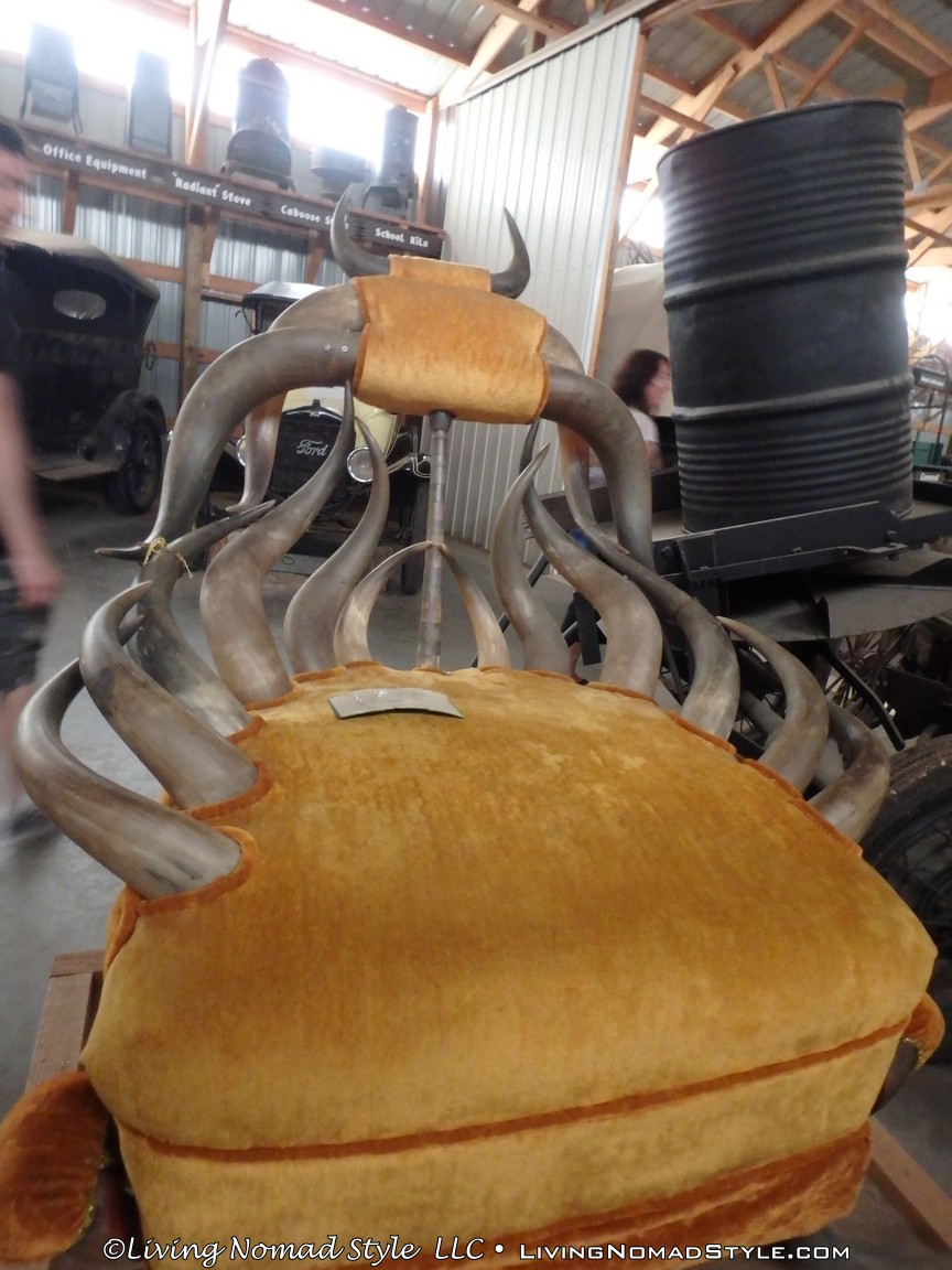 One building was a replica of an old officer’s quarters. One held periodicals from the early 1900s as well as medical devices and pictures of nurses. Next door was an old country school house. And the next building down held wagons of all manner as well as many old period articles like a mobile bar, a chair made out of bull horns, homesteader trunks and a coffee mill.