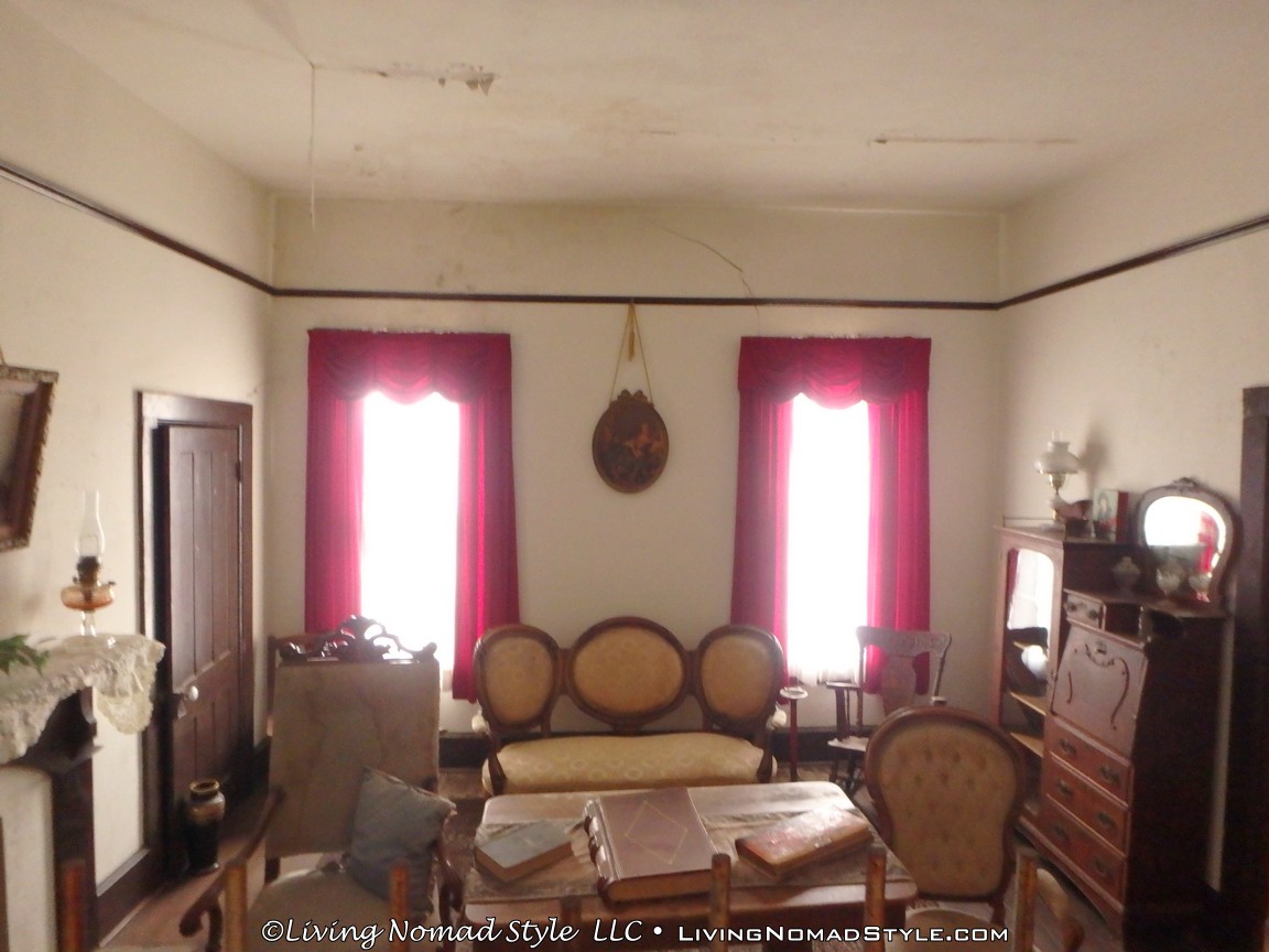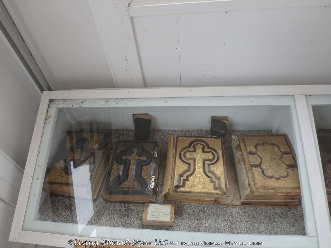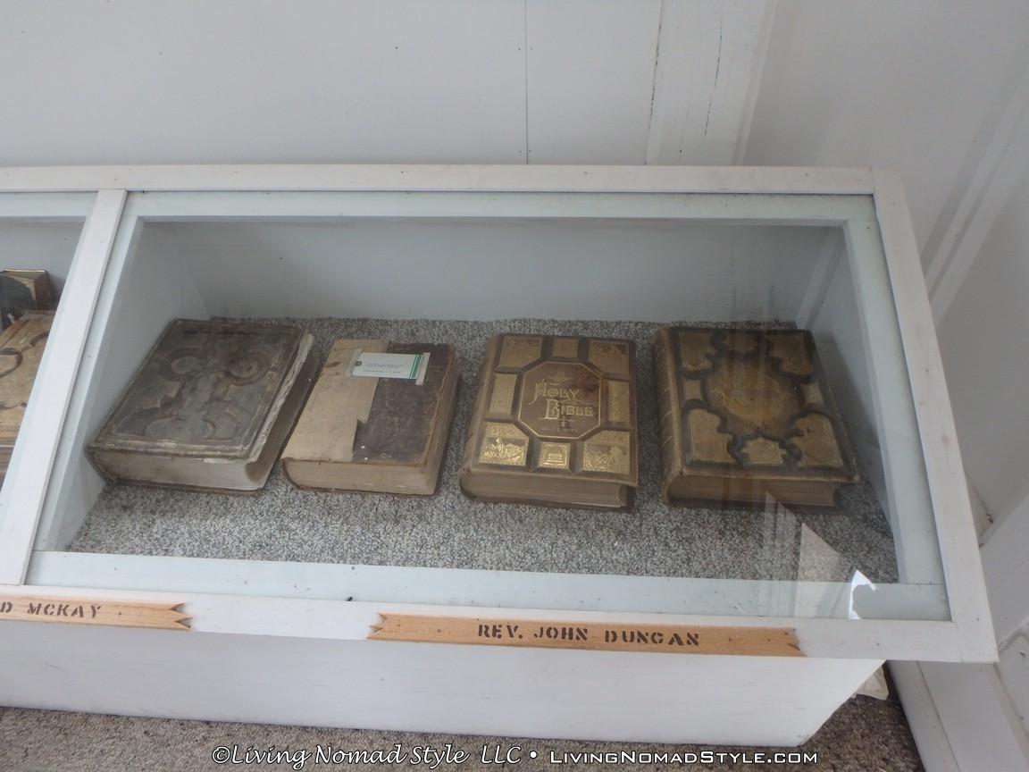 Exiting this building you are guided over to a few old pioneer homes. They had gravel on their roofs. Next to them was a windmill and an old church looking building filled with old bibles and hymnals.