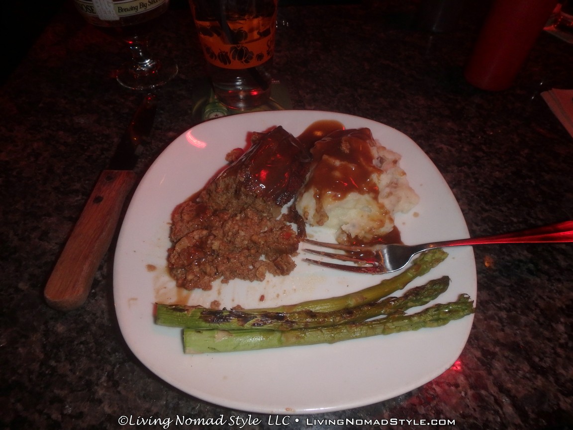 The selections we chose ranged from bacon wrapped meat loaf to a grilled chicken sandwich with shredded BBQ pork and coleslaw on it. On top of all of this, when the fries came out, they were curly (even though they were advertised as regular). This made Mama Nomad happy as she enjoys curly fries. They even had chicken pot pie soup! That was a new one for us. And, another bonus, they had Scottish Ale on tap. This is one of my favorites.