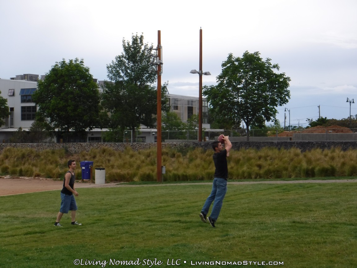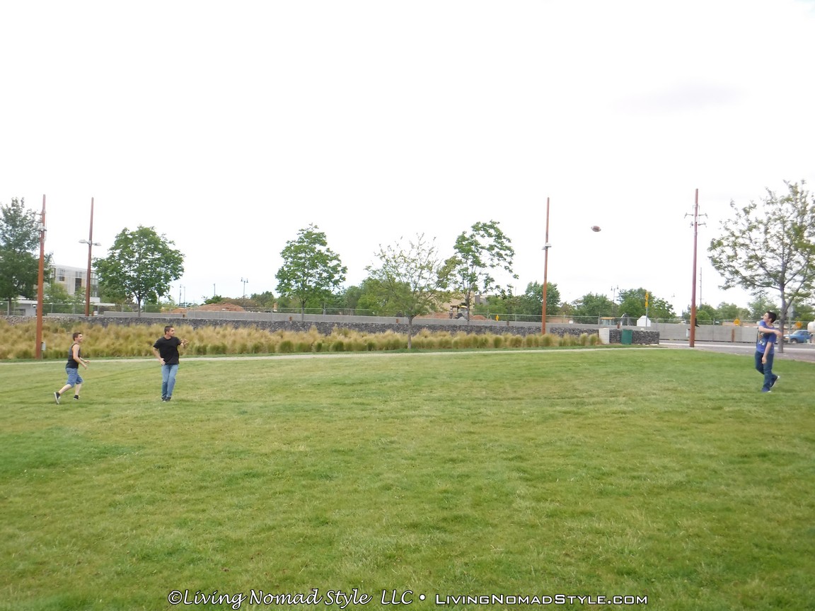 The park itself has quite a bit of green space for a downtown type park area. Near the bathrooms is a big field of open grass. We took time to throw a Frisbee on it as well as throw and kick a football. Plenty of room to run, jump and play.