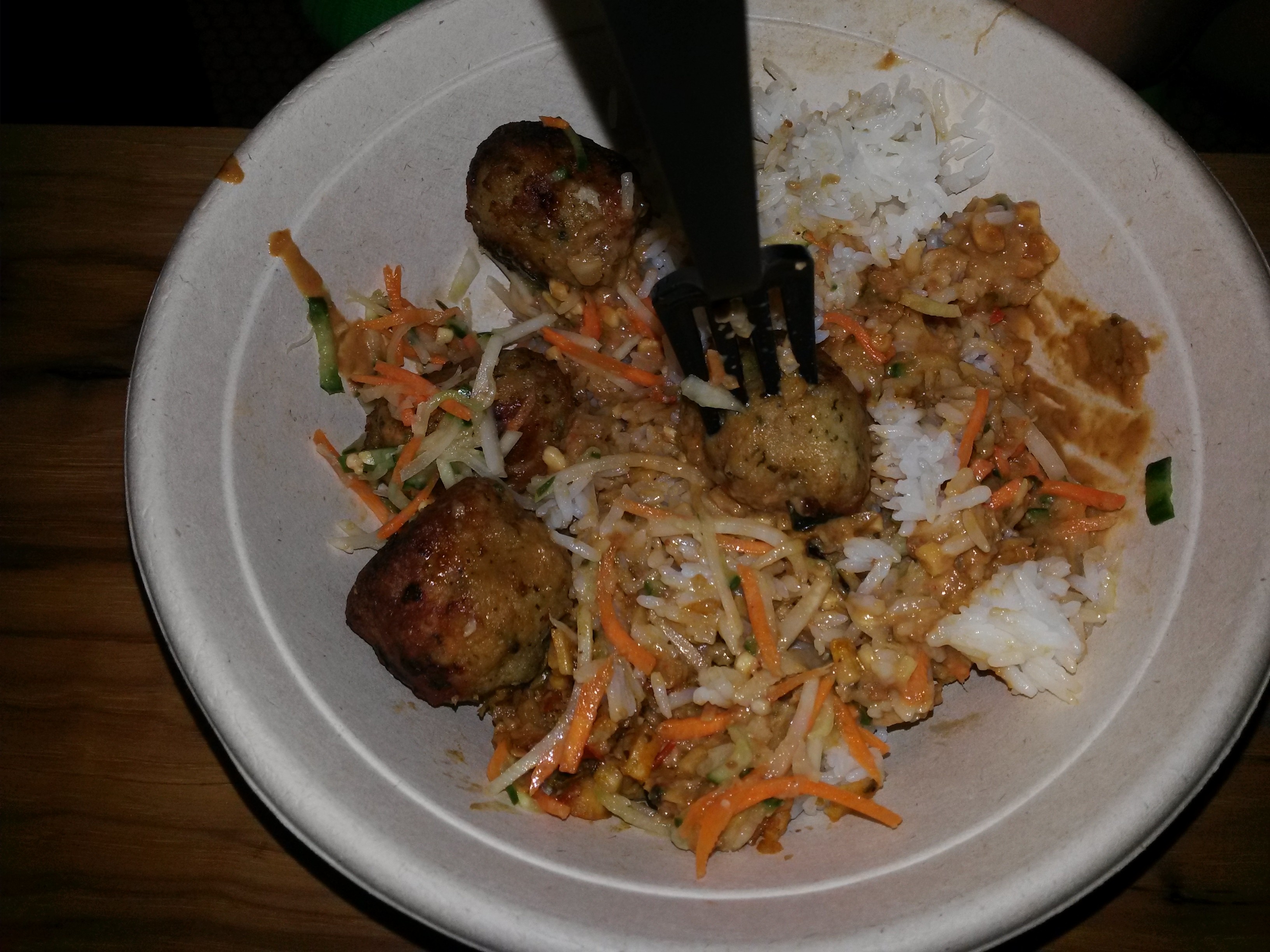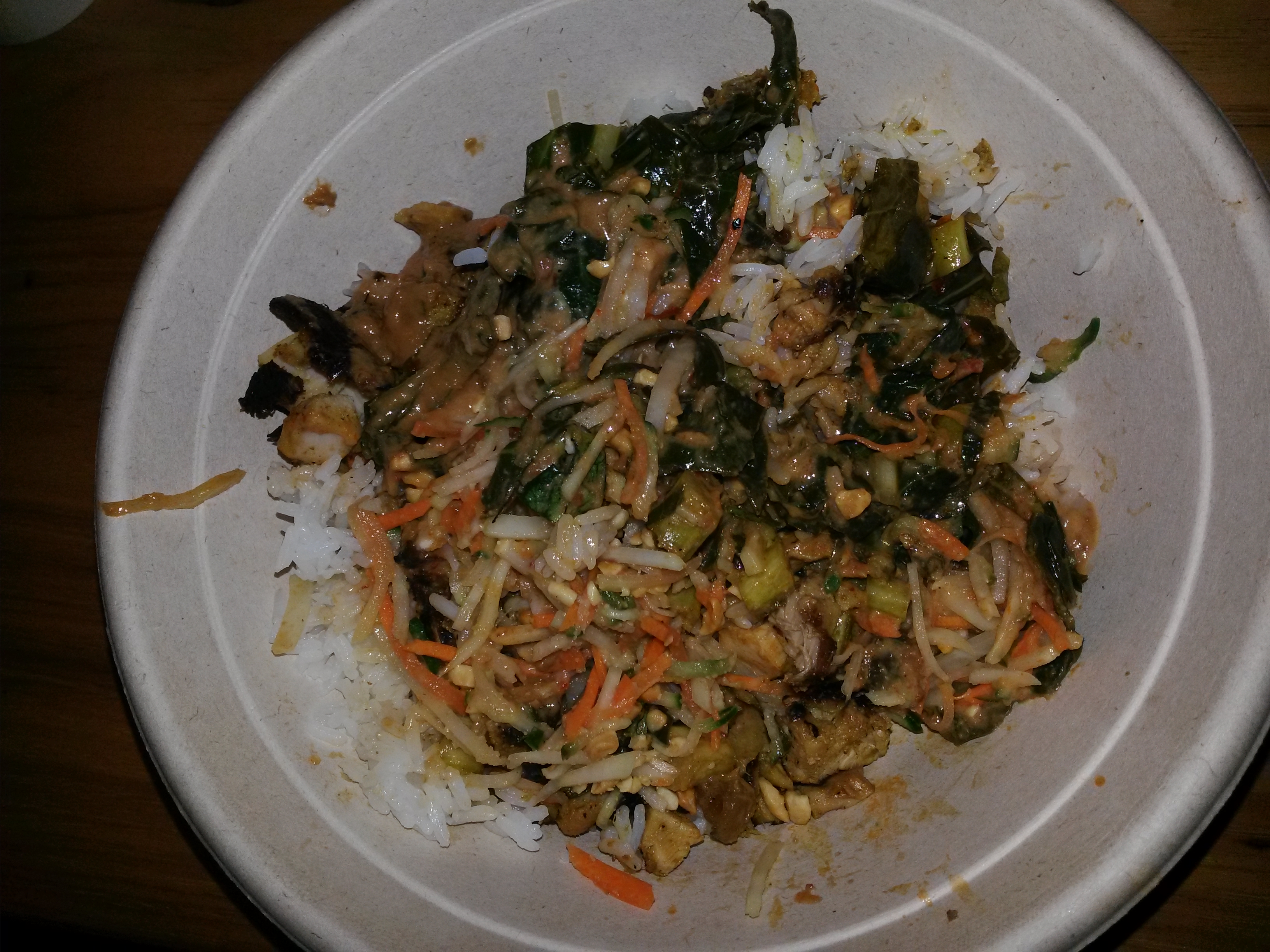 You pick the first layer of your bowl, your base; rice, noodles, salad. Next, your protein; chicken, beef, pork, tofu. Your vegetable; corn, green beans, kale, eggplant. The veggies can vary depending on season; I listed what is named from their website. When we were there they had collard greens (my fave) as an option, as well as rutabaga. Now, your sauce; peanut sauce, green curry, spicy red curry, tamarind vinaigrette. Follow up with a garnish; green papaya slaw, pickled vegetables, herb salad. Lastly, top it off; toasted rice, crispy garlic, crushed peanuts, Thai chillies. As you order, if you have any questions on flavor, just ask for a taste; they’ll happily oblige a sample for you. I also must mention, everything they prepare is gluten-free, wheat-free, and dairy-free. Their website has detailed info about all of their options; including the ingredients, and nutrition. I only listed the basics. If you want to know the seasonings of the meat, veggies, etc., check it out, shophousekitchen.com