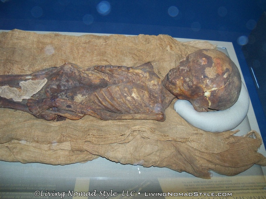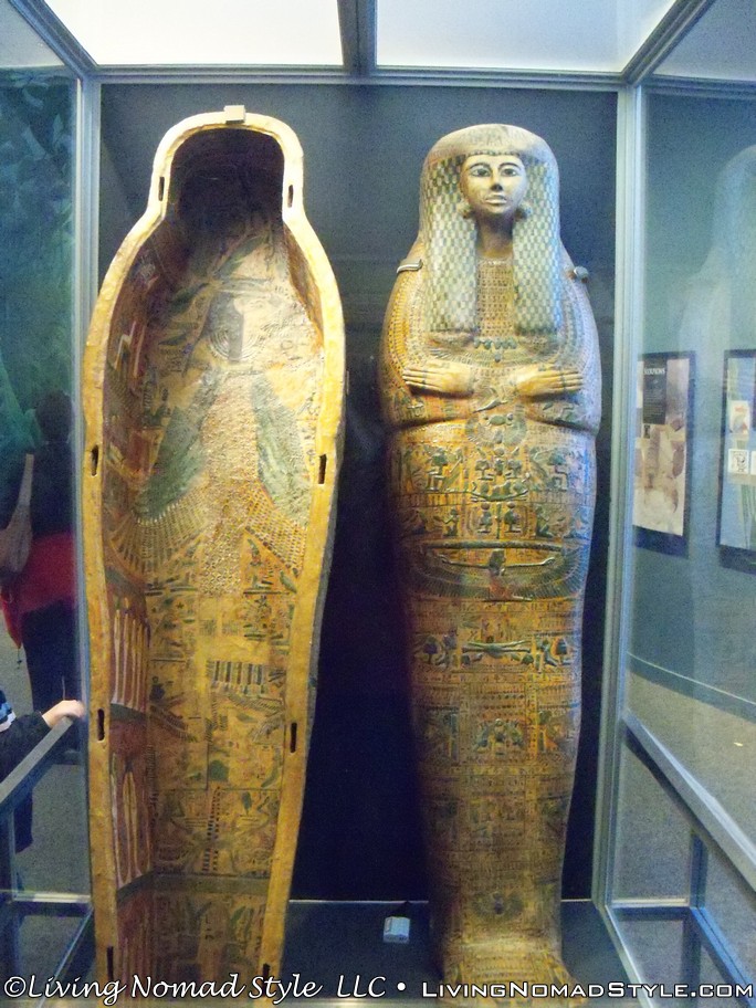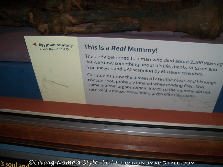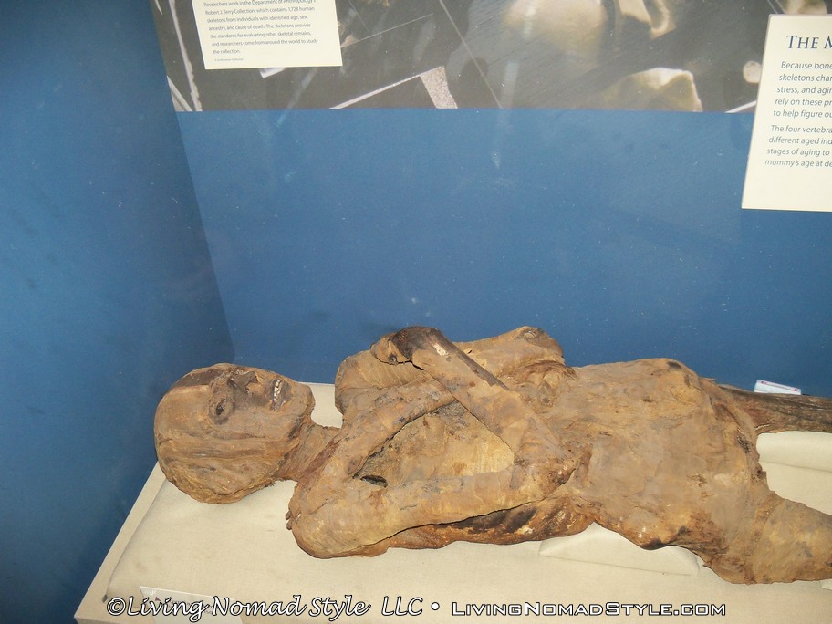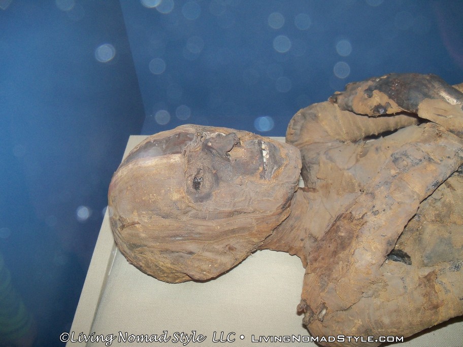 After the gems, rocks, crystals and minerals, we entered an area filled with skeletons of all types of animals; from a platypus to a gray whale and all manner of animal in between, including human. It was a natural progression to go from skeletons to Ancient Egyptian Mummies. We went from plain skeletons to ones that were wrapped and boxed.
