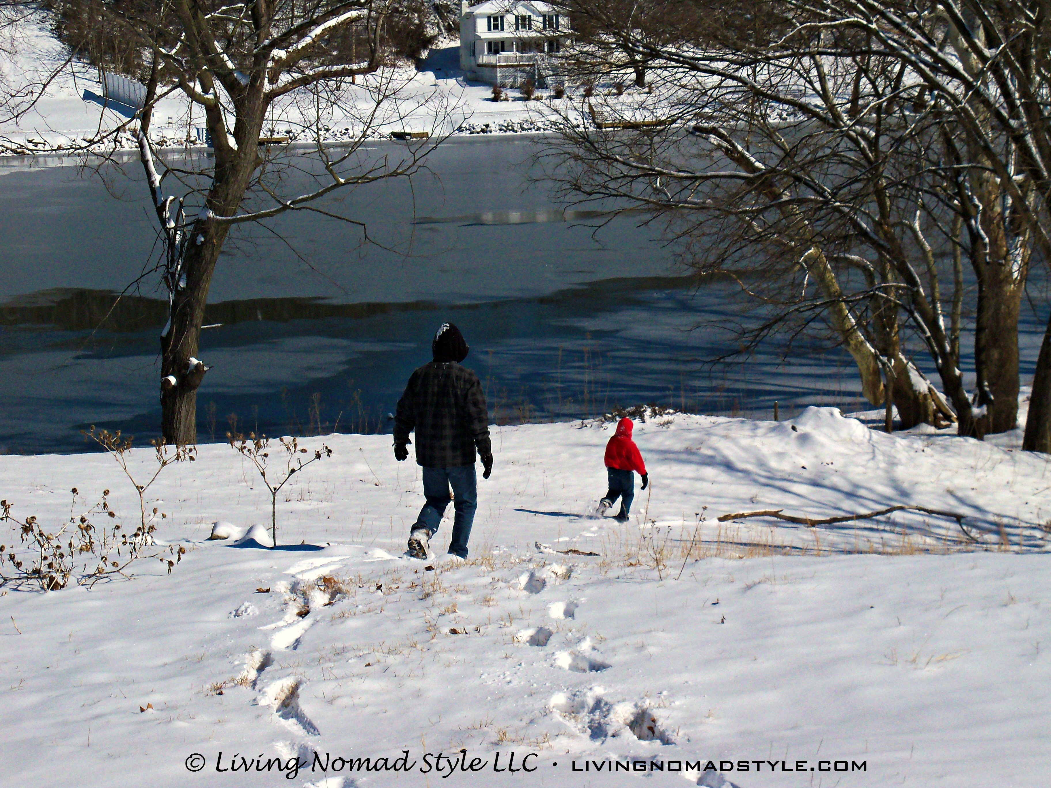 The younger two Nomad sons could not wait to get out , and play in the snow. The oldest Nomad son, being more like myself, preferred to enjoy it from the warmth of the house. While Noah enjoyed reading inside by the fire, Ethan, and Trevor were off to the frozen river. Down by the river, they built themselves a fort. They were very excited Tuesday to get back down to the river to see if their fort kept out the snow. I must say, the fort did a pretty good job.