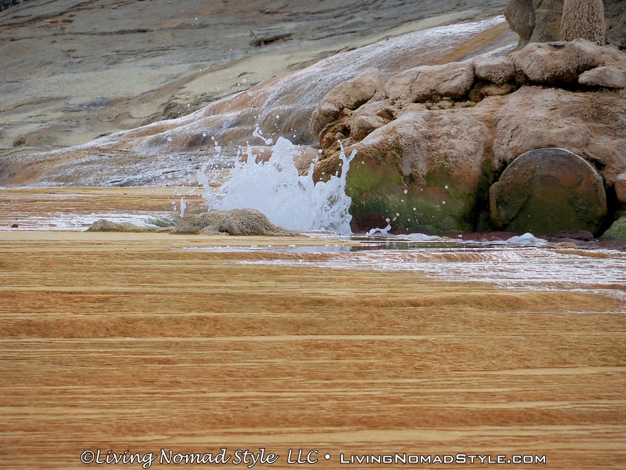 However, when we were there, something was wrong with the mechanism that allowed this to happen and we never got to see it release the water. It was more of a steady flow like a stream out of where the geyser outlet was. All of the surrounding area was orange and red. The boardwalk around it had wood that looked like concrete from all of the minerals. The story was very interesting and the geyser would have been interesting to see.