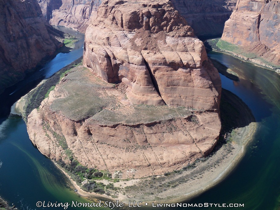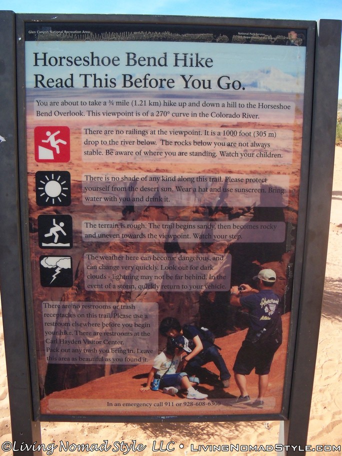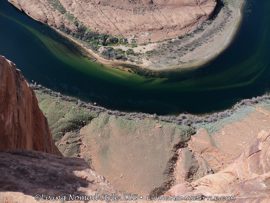 The pull off has paved parking and outhouse style bathrooms. From the parking area, it is a 1.5 mile hike, round trip, to get to the steep cliff overlook. The entire way there is fairly sandy and, with the exception of having to hike up a steep hill there and back, the hike was rather easy. We arrived at the overlook at it was magnificent. We had never seen a river do this. And, we were 1000 feet above it to view it. The boats in the river looked like floating pieces of rice, they were so small.