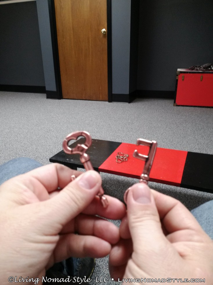 While we waited, there were puzzles on the table for you to warm your mind up with. Solved the ones sitting there except for the Celtic Coaster. If you solve it, you actually get one free to take home. Additionally, while we waited, there is a sheet that describes how to open different locks. Useful tip: study this sheet. You will get one when you are in the room. But knowing the different types, how to clear them and open them will save you valuable time.
